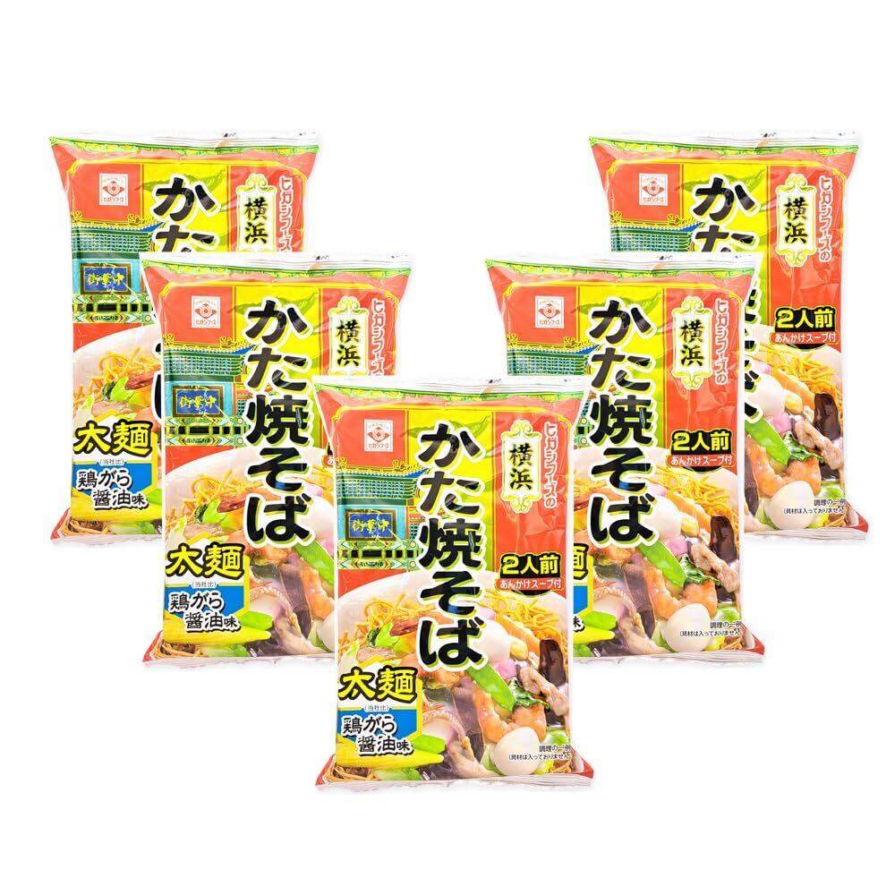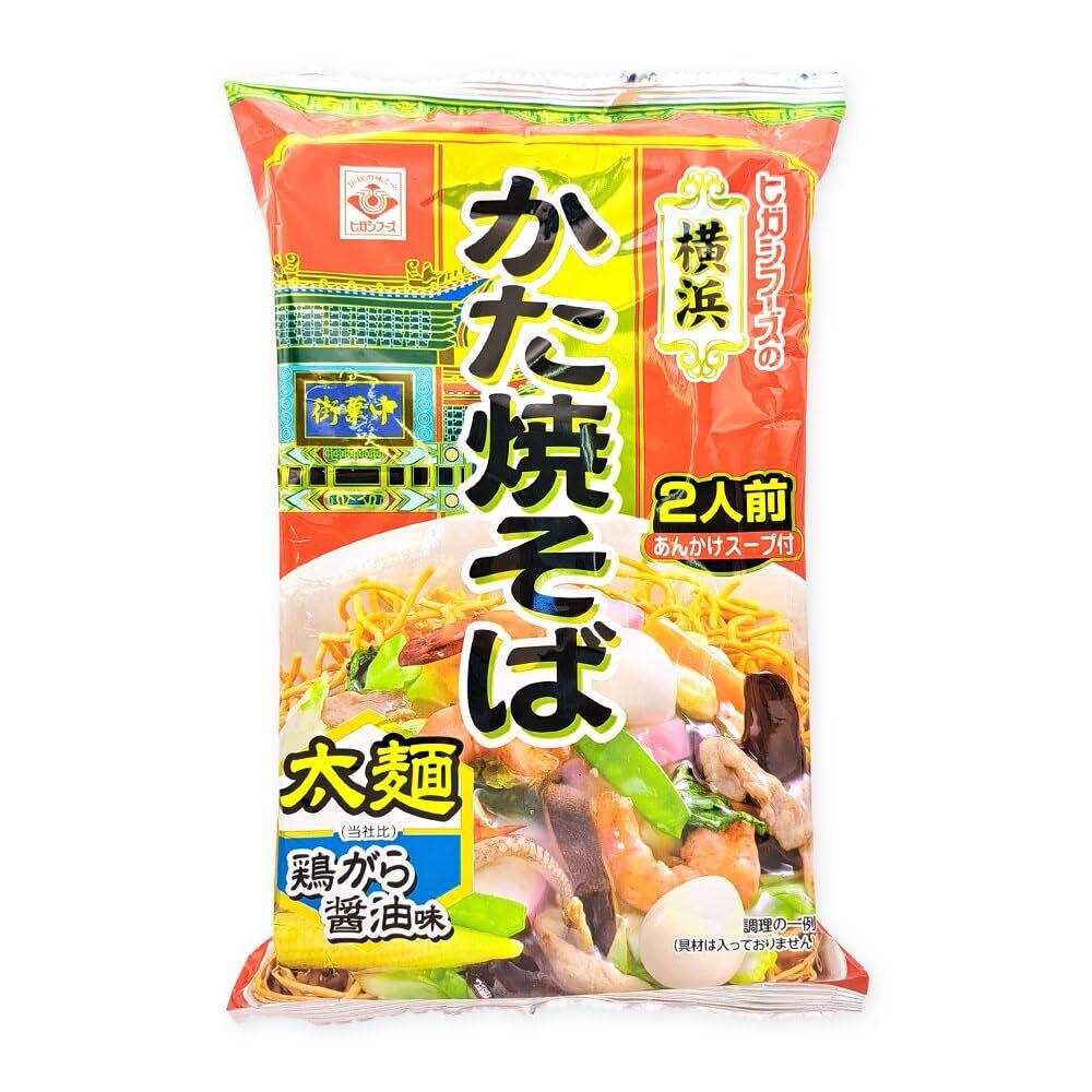 長崎皿うどん120.8g、海鮮皿うどんに続いて姉妹品できました 今回はサクサク太麺タイプ・醤油と鶏がらベースのあんかけスープの2人前です。 本格的な味をお楽しみください。ヒガシフーズの「横浜かた焼そば2人前」が5袋入っています。