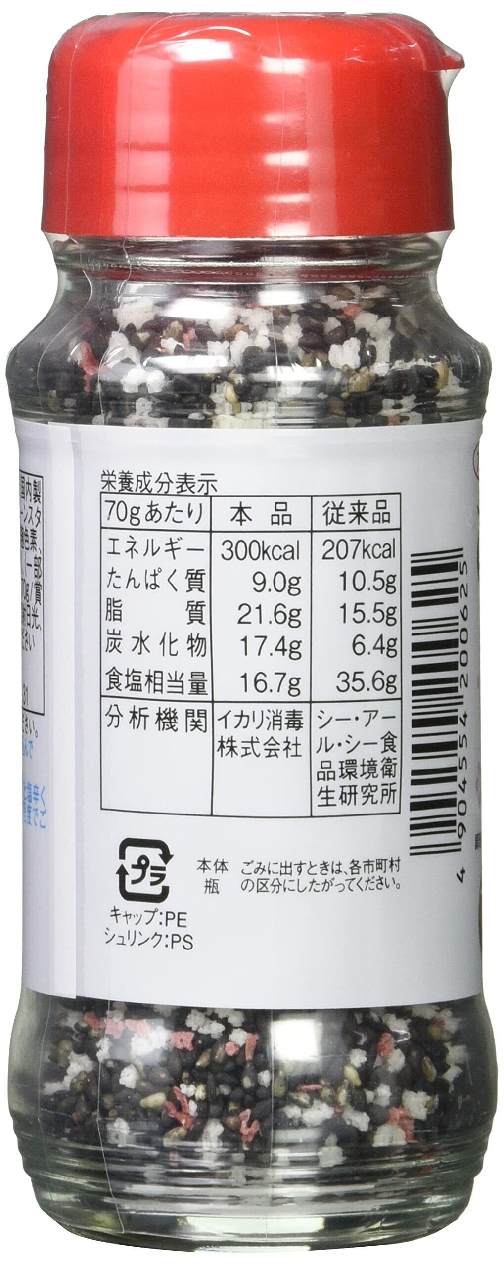 独自の製法により、ごまと同じ大きさの減塩調味塩顆粒を造り、ごまと調味塩が同量出る様に、食べやすく工夫しました。