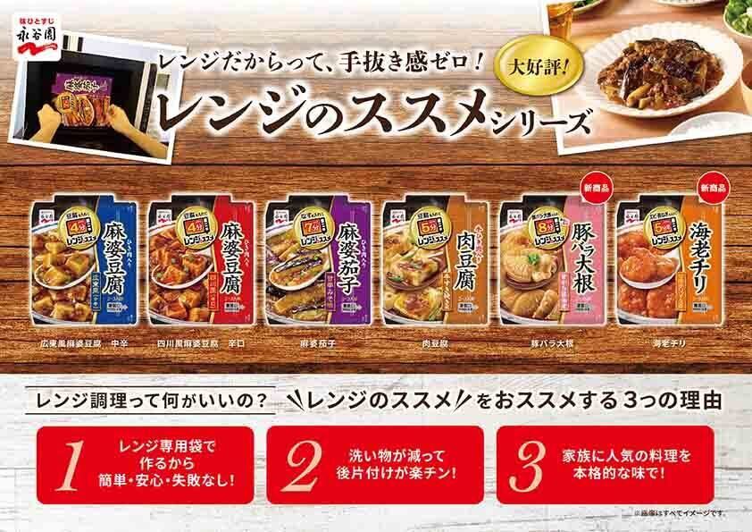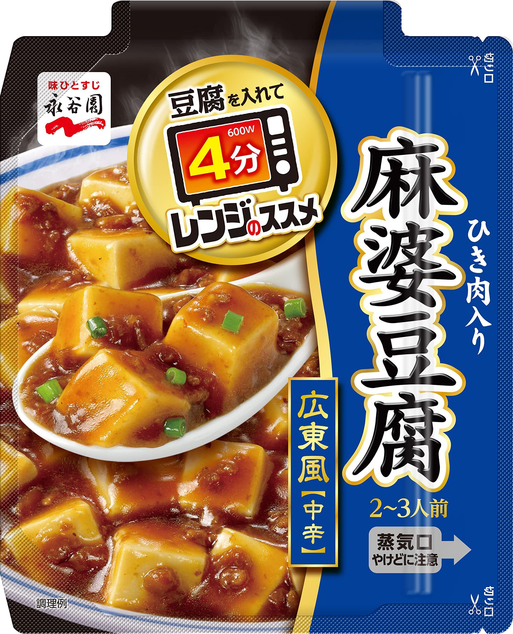 電子レンジ専用パウチに入った麻婆豆腐の素です。ひき肉入り麻婆ソースが入ったパウチに豆腐1丁を入れ、電子レンジ(600W)で4分加熱するだけで麻婆豆腐ができあがります。