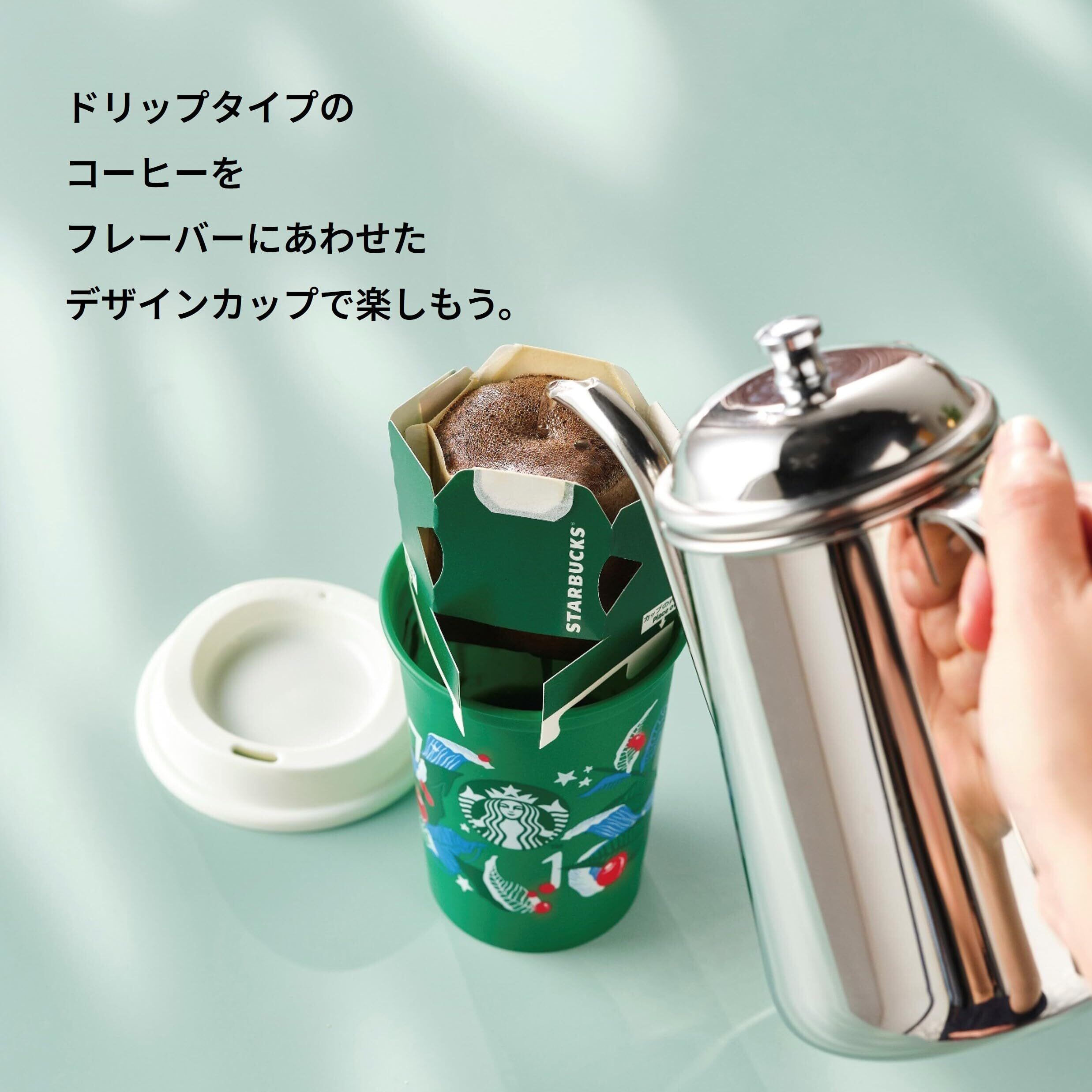 スターバックスを代表する「ハウス ブレンド」のパッケージデザインのモチーフを活用した限定デザインのカップと、ハウス ブレンド1杯分がセットになった製品です。フレーバーに合わせたデザインカップで、スターバックスの味わいをおうちでも。