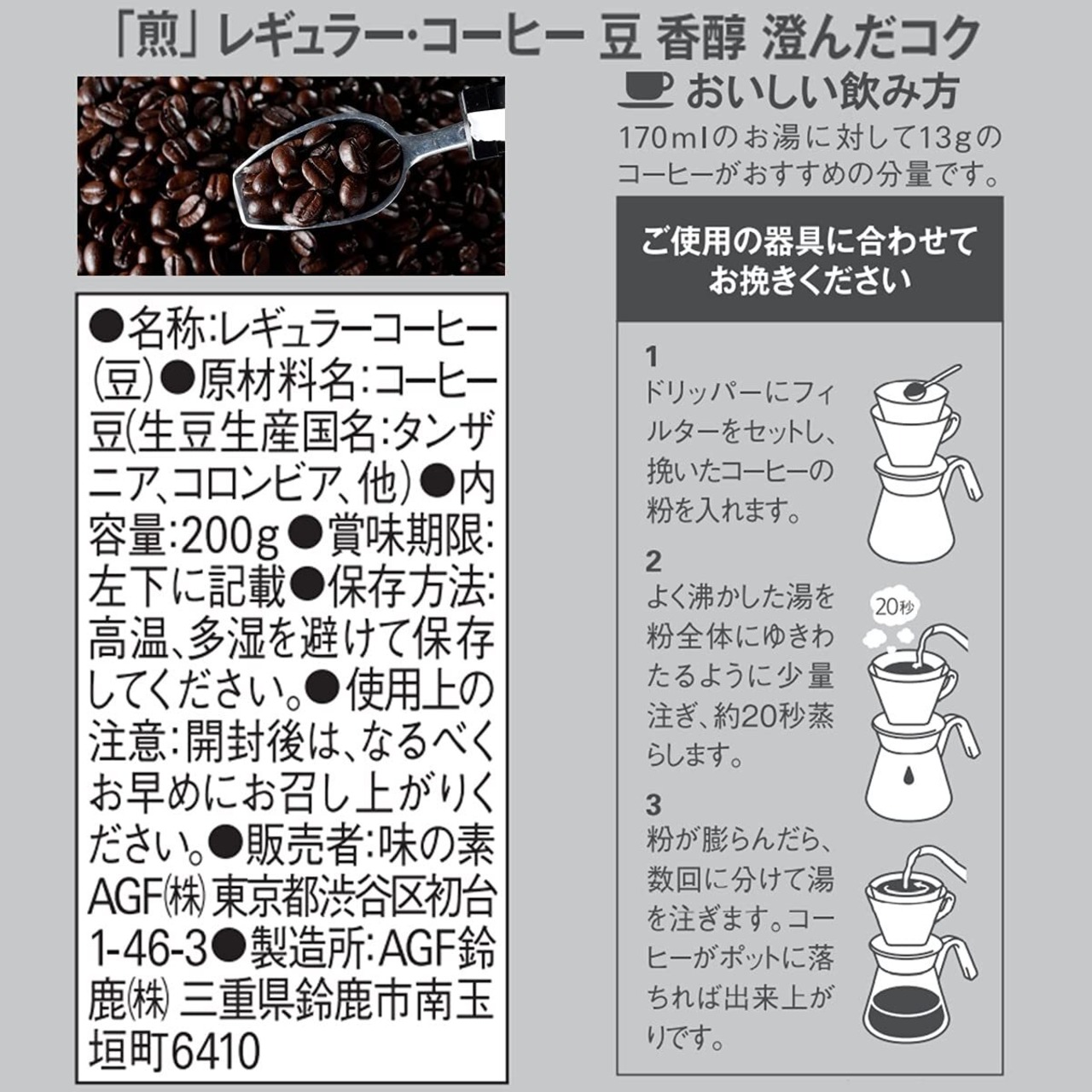 AGF(エージーエフ) 「煎」 レギュラーコーヒー 豆 濃厚 深いコク200gは、プレミアムドリップコーヒー「煎」をコーヒー豆から挽いて味わいたいという声にお答えして開発したコーヒー豆です。ご自身で挽いてドリップしても濃厚 深いコクの味わいを再現できるよう豆の配合を独自に調整し、しっかりとしたコクと奥行きのある味わいを実現しました。