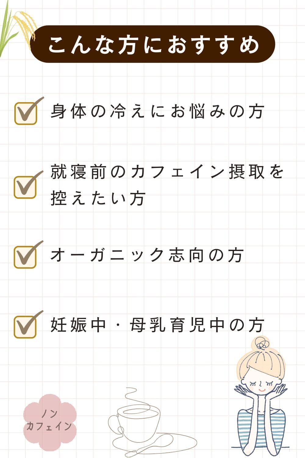 【ノンカフェイン】焙煎玄米を使用しており、穀物由来の甘さや香ばしさが特徴。カフェインを控えたい妊婦さんや母乳育児中の方にもおすすめです。夜の時間帯でも安心して召し上がっていただけて、体に良いのにクセがなく、飲みやすいのが特徴です