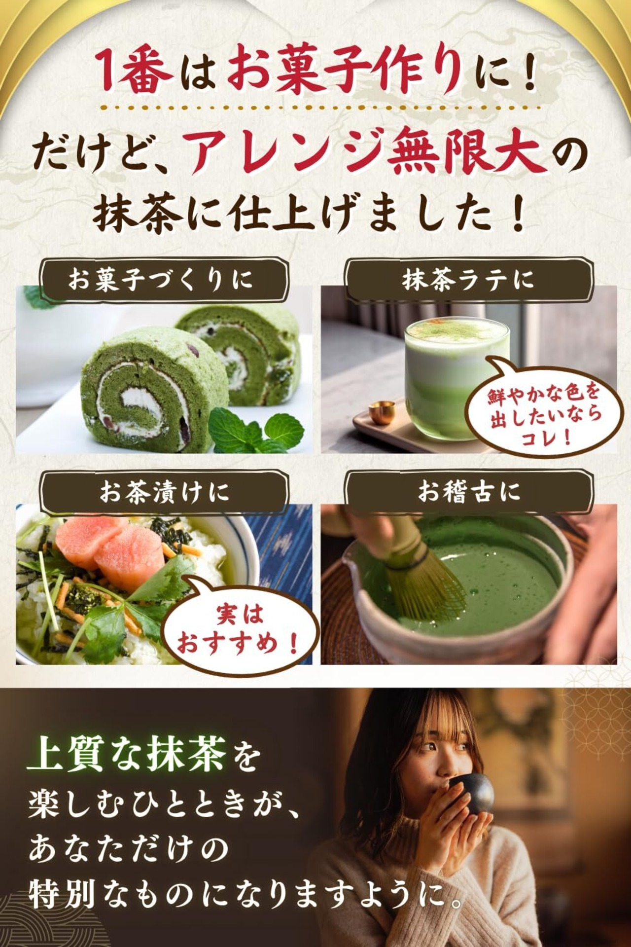 【全国100店舗以上の使用実績】本商品と同じ原料の抹茶は、全国のカフェやレストランなどでご使用いただいております。全国各地のプロご愛用の自信のある高品質な抹茶を、ご家庭向けに商品化しました!
