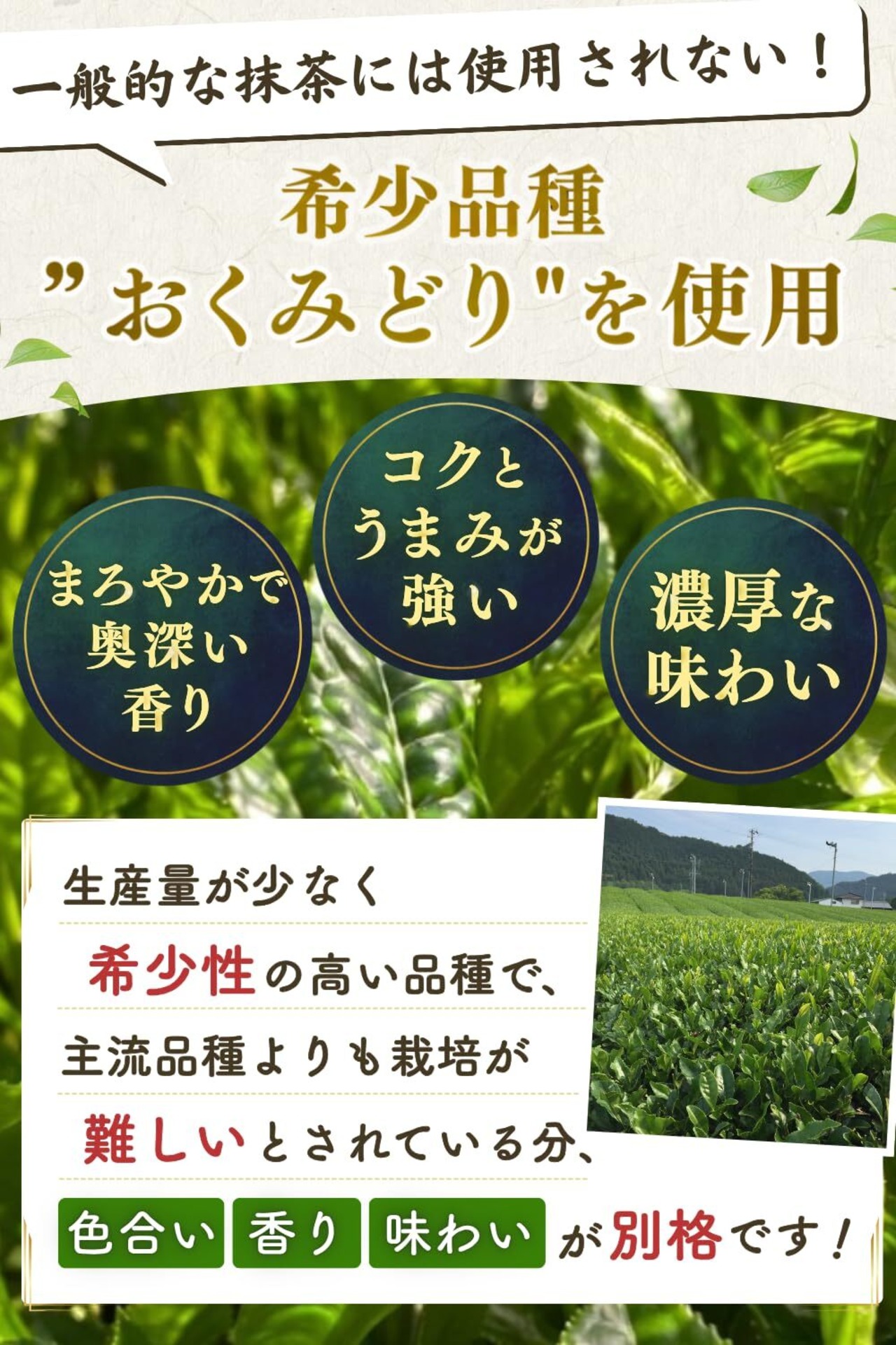【希少品種おくみどりを使用】栽培が難しいとされる希少な品種「おくみどり」を使用。一般的な抹茶粉に使用される「やぶきた」よりも濃厚な味わいでうまみが強く、深く美しい緑色が際立ちます。