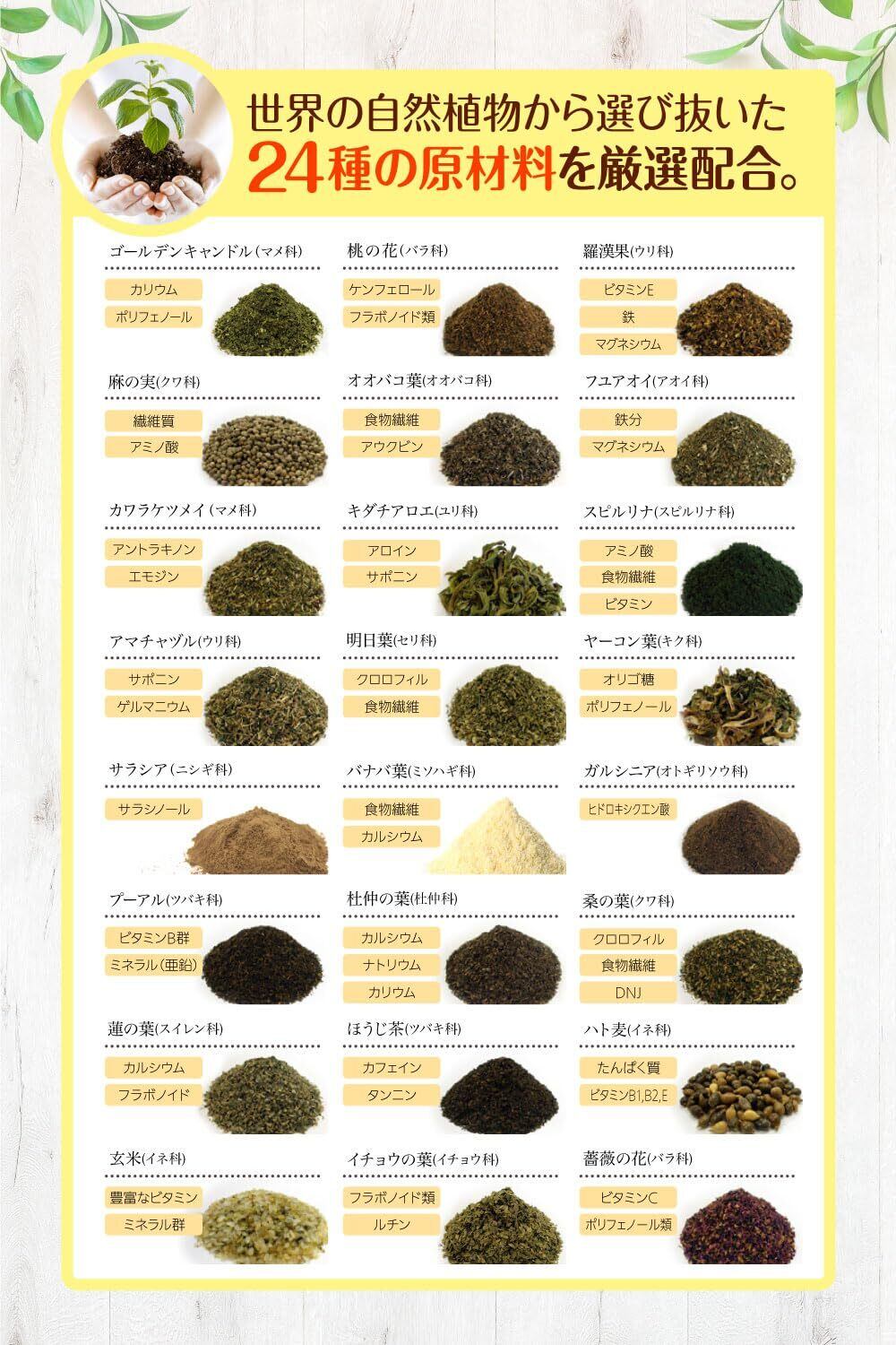 原材料: ゴールデンキャンドル (インドネシア、タイ)、 ほうじ茶 、 玄米 、 ハト麦 、 プーアル 、 麻の実 、 ガルシニア 、 バナバ葉 、 ヤーコン葉 、 スピルリナ 、 明日葉 、 桑の葉 、 桃の花 、 イチョウの葉 、 オオバコ 葉、フユアオイ、 薔薇の花 、 カワラケツメイ 、 キダチアロエ 、 羅漢果 、 杜仲 の葉 、 アマチャヅル 、蓮の葉、 サラシア