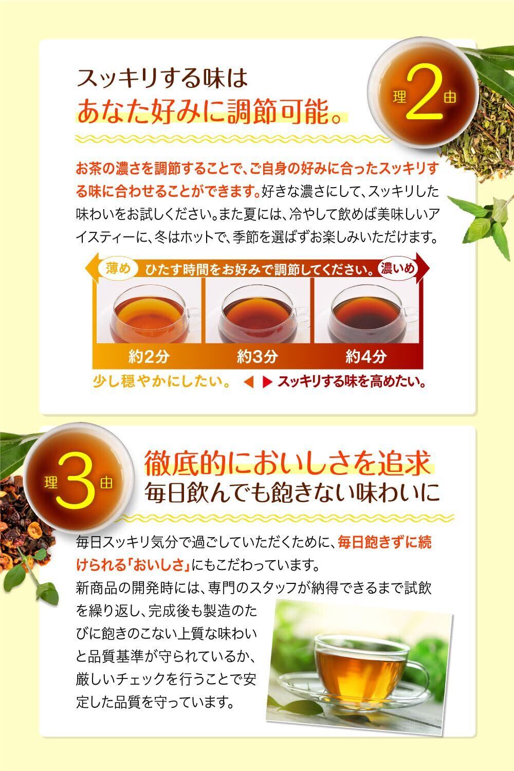お召し上がり方 2:やかんで煮出し、まとめて作ることも出来ます ①ティーバッグ1包に対し約1リットルのお湯を沸かします。(お湯の量はお好みで調節してください。) ②沸騰したらティーバッグ1包を入れ、約3分間煮出してください。 ③できあがったお茶を別の容器に移し、アイス、ホット、お好みで2〜3日に分けてお飲みください。 ④冷蔵庫で保存する場合も、2〜3日程度を目安にお飲みください。