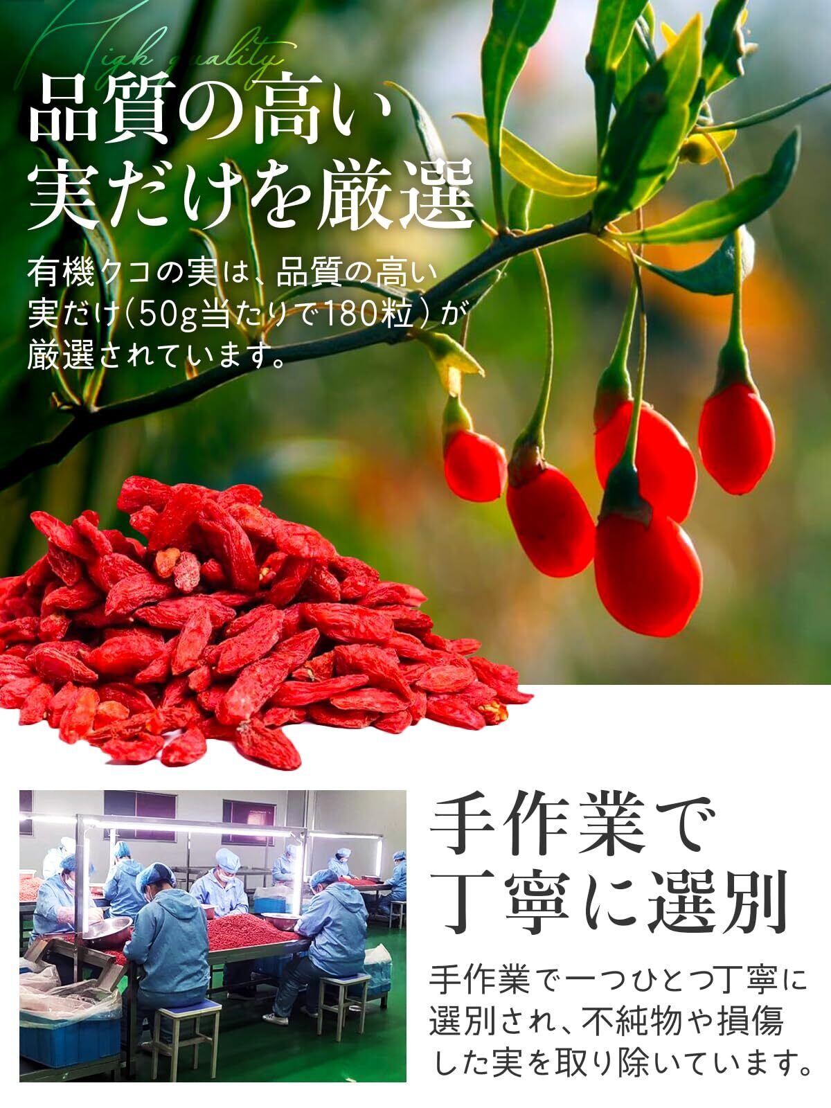 【商品情報】(1)原材料:有機クコの実(厳選規格:50g当たり約180粒の大粒)(2)原産国:中国 寧夏回族自治区中寧市(3)チャック付き袋を使用しているので保存にも持ち運びにも便利。