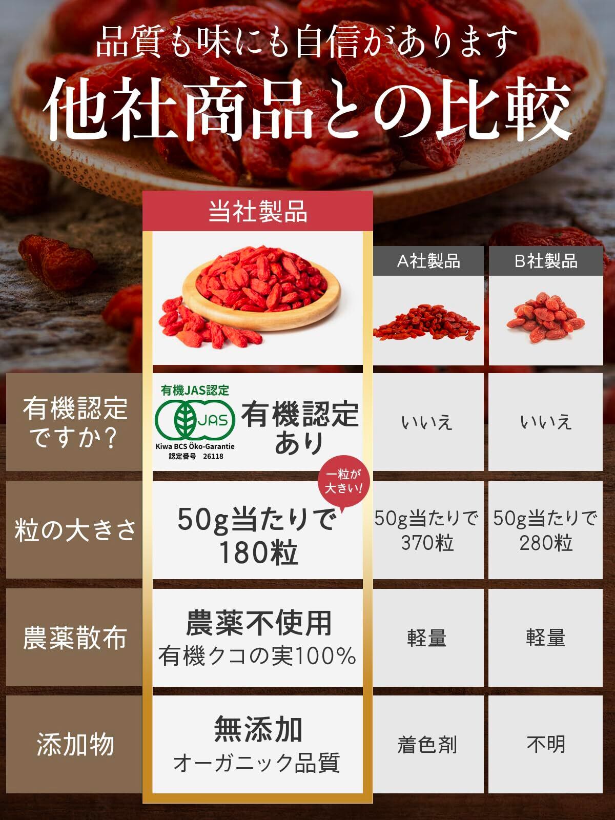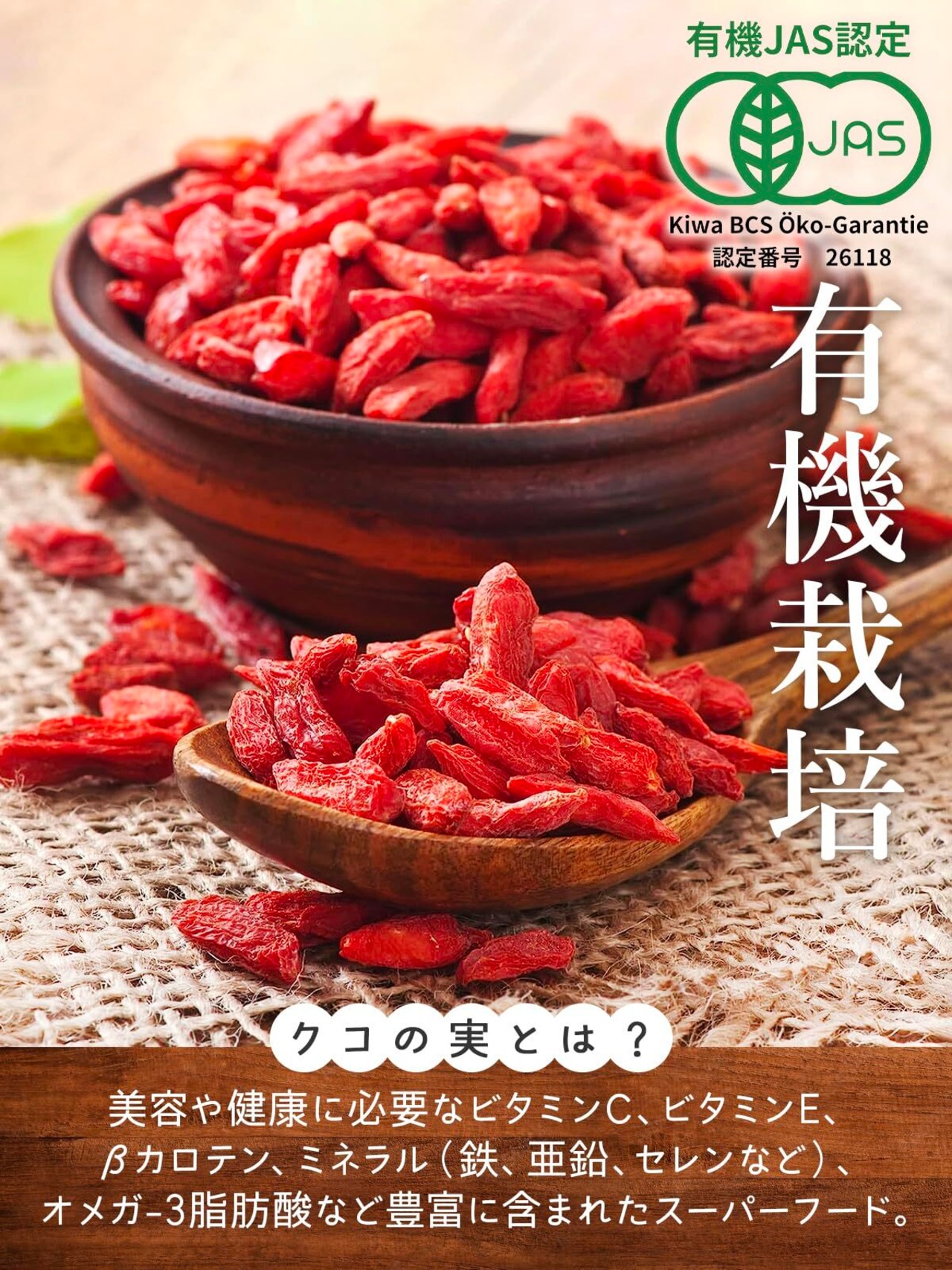 【有機JAS認証】当社の有機クコの実は、厳選された有機栽培のクコの実を使用しています。無添加、農薬や化学肥料を一切使用せずに栽培された、自然の恵みが凝縮された製品です。そのため、安心してお召し上がりいただけます。