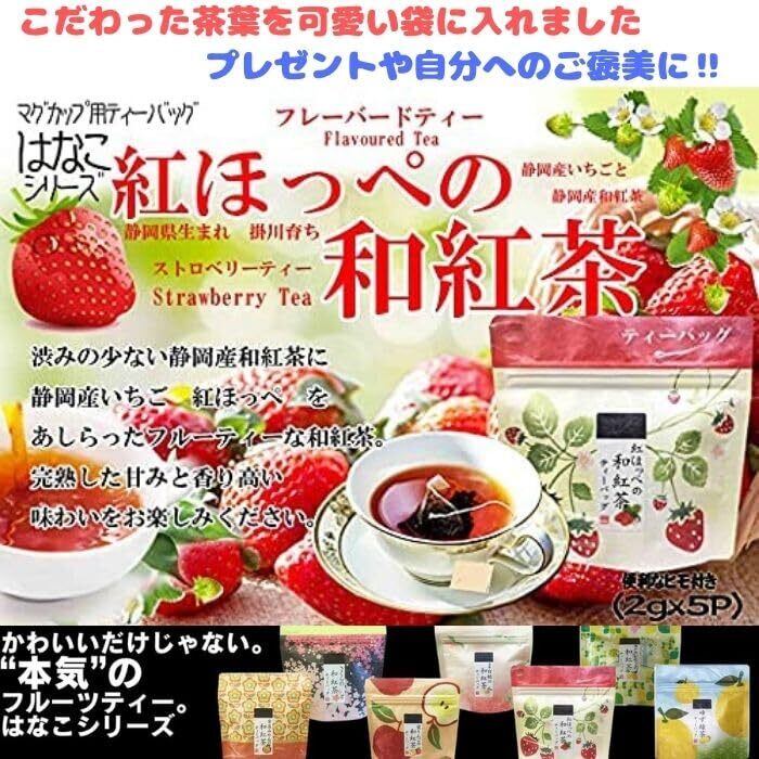 【紅ほっぺの和紅茶ティーバッグ2g×5p】 原材料名、紅茶、乾燥いちご(静岡県産)/香料 「渋みの少ない静岡県産和紅茶に静岡県掛川産の紅ほっぺいちごをあしらった甘味のある和紅茶」