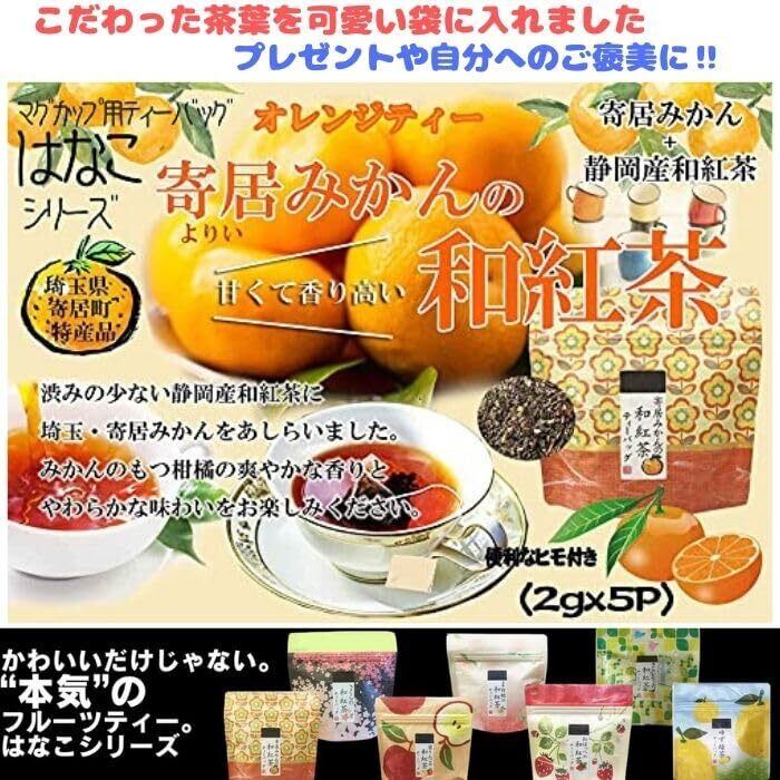 【寄居みかんの和紅茶ティーバッグ2g×5p】 原材料名、紅茶(静岡県産)みかん(埼玉県産)/香料 「渋みの少ない静岡県産和紅茶に埼玉寄居みかんをあしらいました。みかんのもつ柑橘の爽やかな香りとやわらかな味わい」