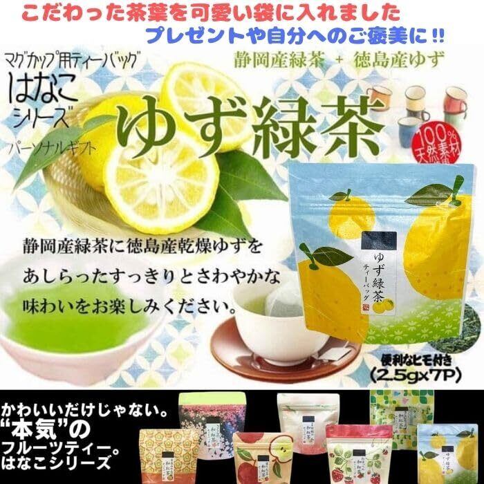 【ゆず緑茶ティーバッグ2.5g×7p】 原材料名、緑茶(静岡県産)乾燥ゆず(徳島県産) 「徳島の乾燥ゆずをあしらったはんなりした香りの良いスッキリとした緑茶」