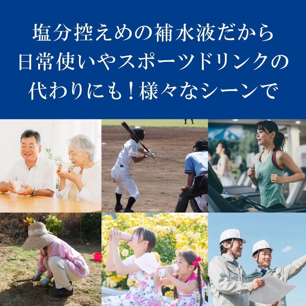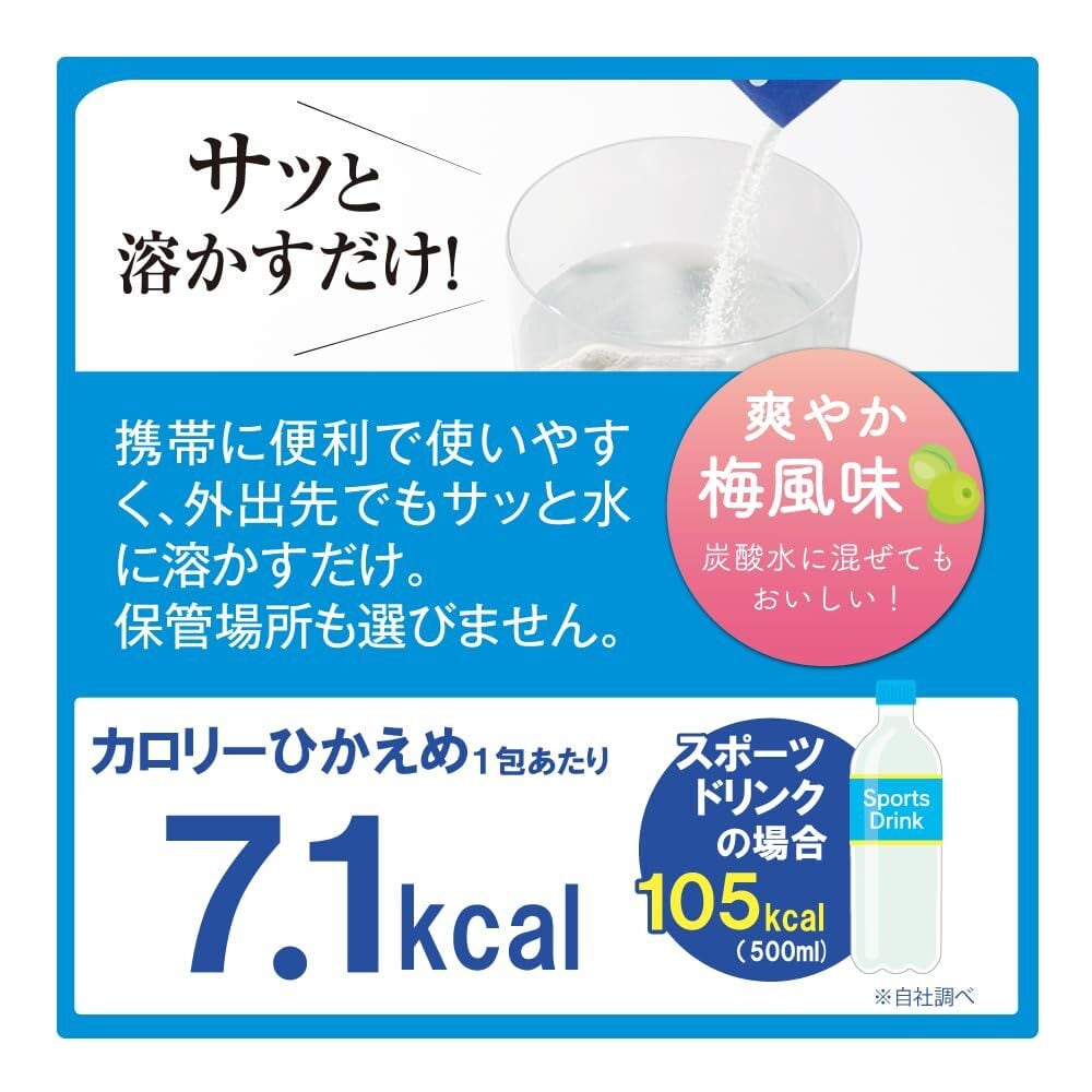 失われたカラダの水分とミネラルを効率よく補給&保持。 さらに「元気」、「すっきり」をサポートします。/ 持ち運びにも便利な個包装 【旅行や運動のお供に】水分補給と同時に活力をチャージする潤い補水液。失われた水分・塩分を効率よく補給できるように考えられた商品です。 ナトリウム、ブドウ糖にクエン酸、ヒアルロン酸、アルギニン、ビタミン、食物繊維配合!日常の水分補給から作業現場、工場・倉庫、学校・幼稚園、介護施設、スポーツジムなど、多くの場所で活用されています。 【嬉しい多機能】「潤い補水液パウダータイプ」は3つの働きをサポート。 ●水分補給・保持●元気サポート●すっきりサポート 【美味しく飲みやすい】お子様やご高齢の方も飲みやすい、すっきりと爽やかな梅風味(和歌山県産南高梅を使用) 【簡単で便利】携帯に便利で使いやすく、外出先でもサッと水に溶かすだけ。炭酸水に割ってもおいしい!いつでも手軽に効果的な水分補給ができます。保管場所を選ばないコンパクトさが多くの方に選ばれる理由です。 【経済的で続けやすい】1包あたり105円と経済的。約500mlの水に1袋を入れ、よく混ぜてお飲みください。【人工甘味料不使用!】1包あたり7.1kcal!カロリーを気にせずお飲みいただけます。