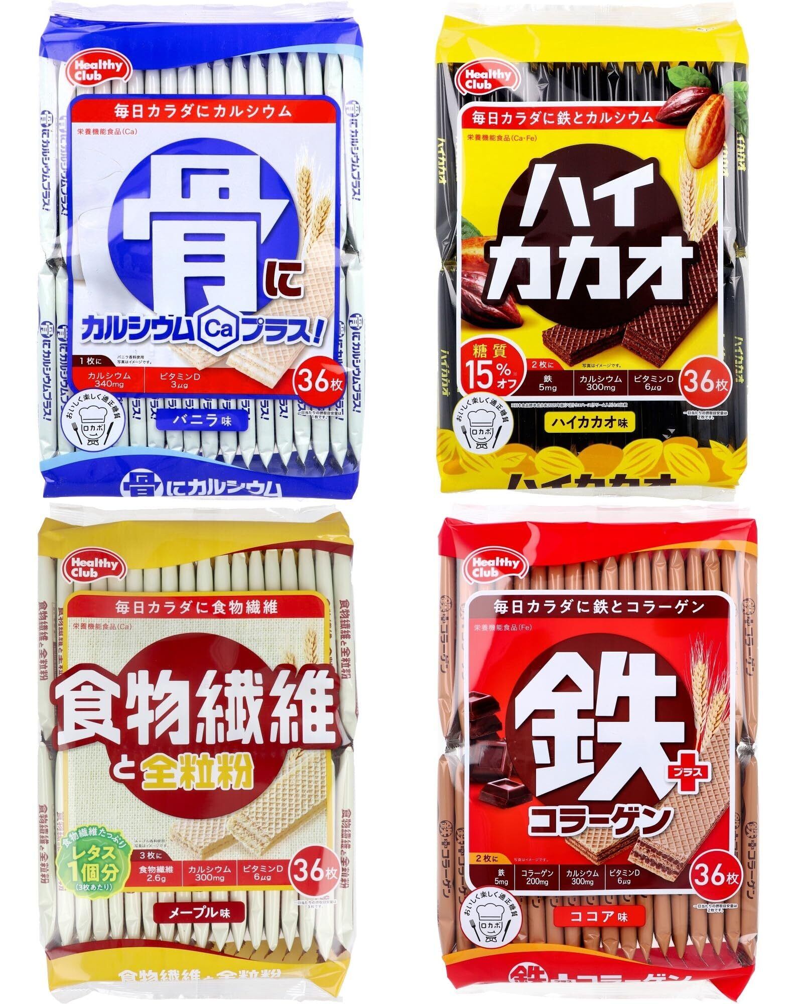 【セット買い各1袋×4種】ハマダコンフェクト ヘルシークラブ 【骨にカルシウムプラス! バニラ味 36枚入 鉄プラスコラーゲン ココア味36枚入 食物繊維と全粒粉 メープル味 36枚入 ハイカカオウエ 糖質15%オフ 36枚入り 】ウエハース 栄養機能食品 ロカボ