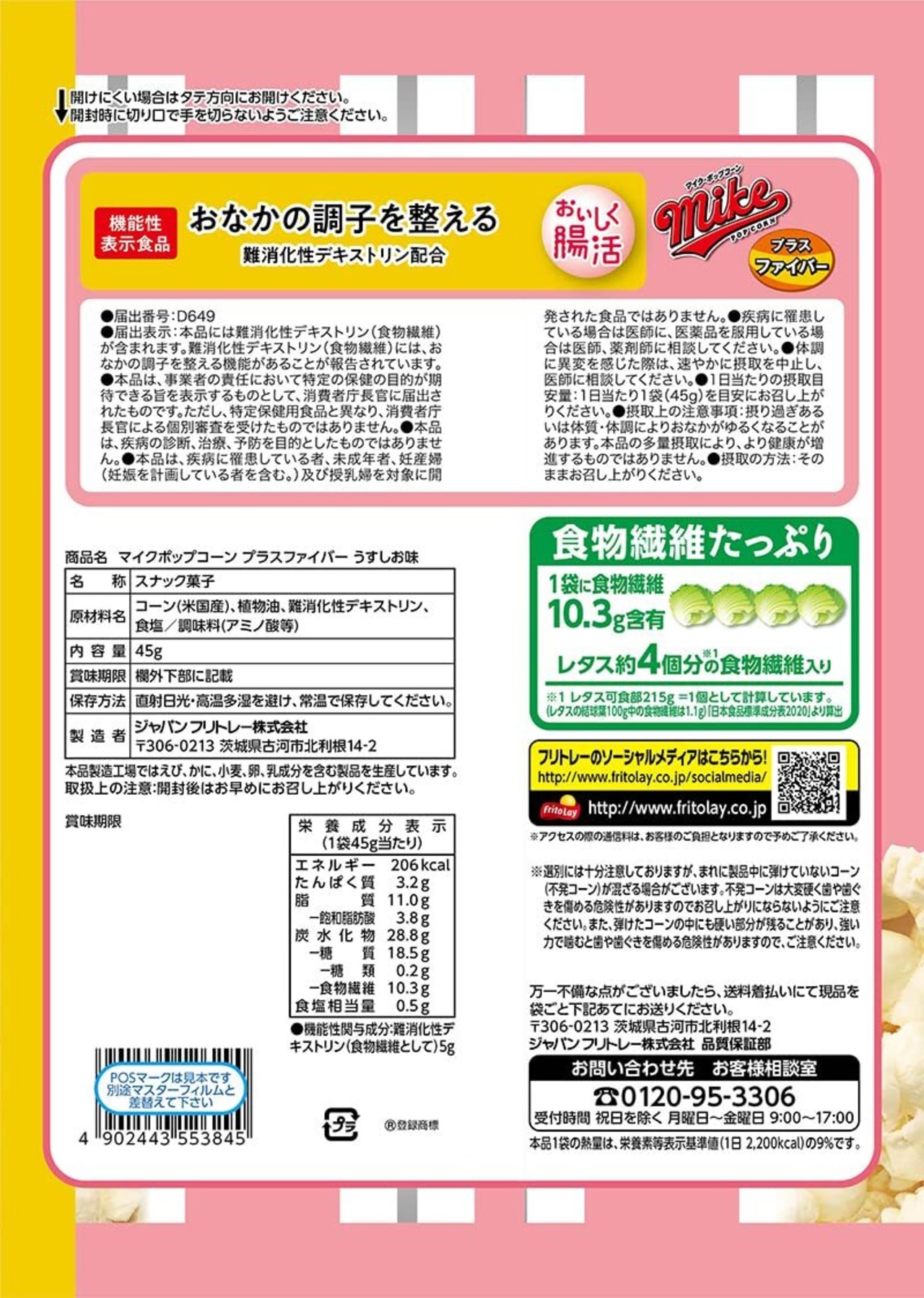 スナック菓子初!『マイクポップコーン プラスファイバーうすしお味』は、おなかの調子を整える機能がある難消化性デキストリン(食物繊維)が配合された、スナック菓子業界初となる機能性表示食品です。お腹の調子を整える本品には難消化性デキストリン(食物繊維)が含まれます。