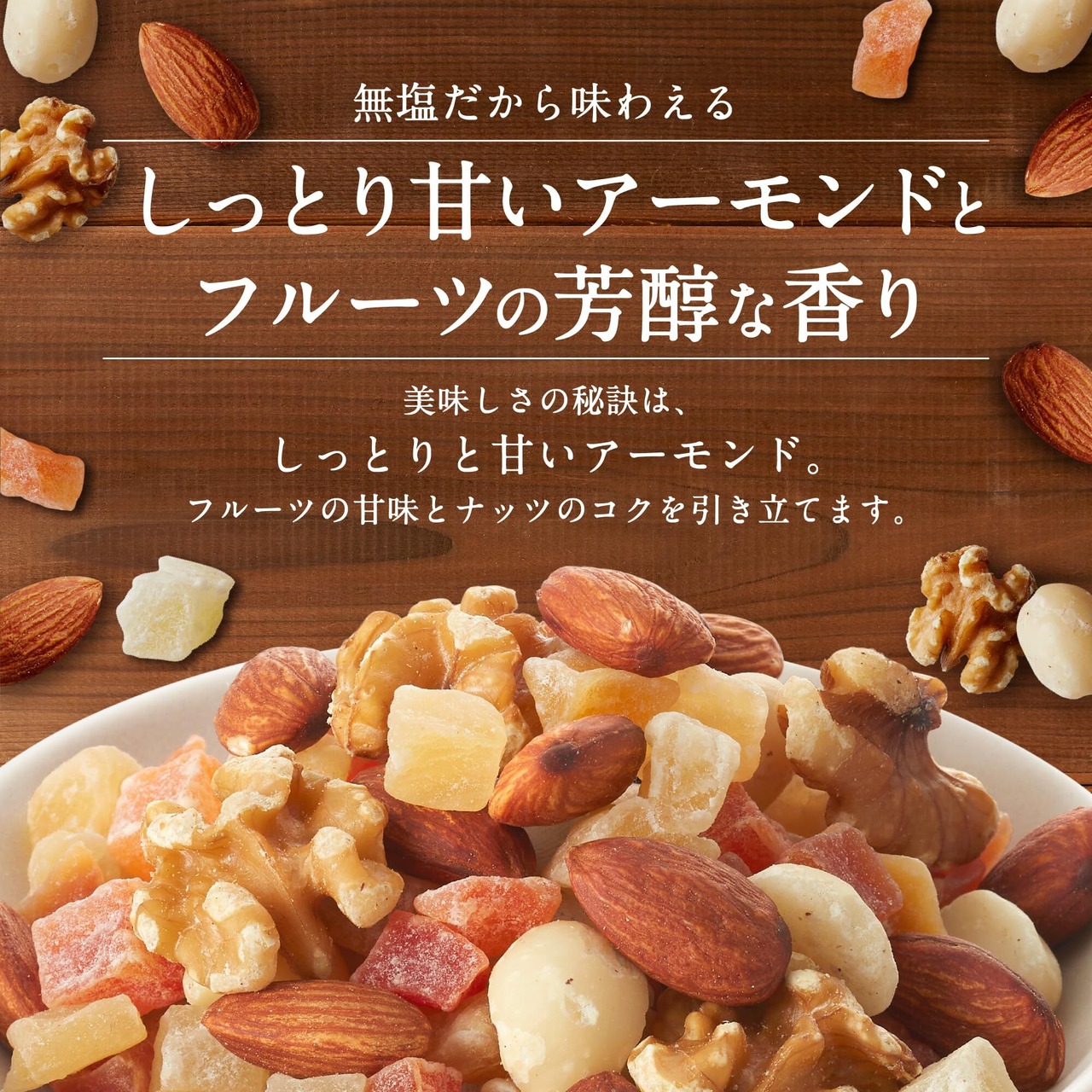 【手軽に毎日の美と健康を】食塩不使用のナッツのおいしさとフルーツの甘みが特徴のミックスナッツ。