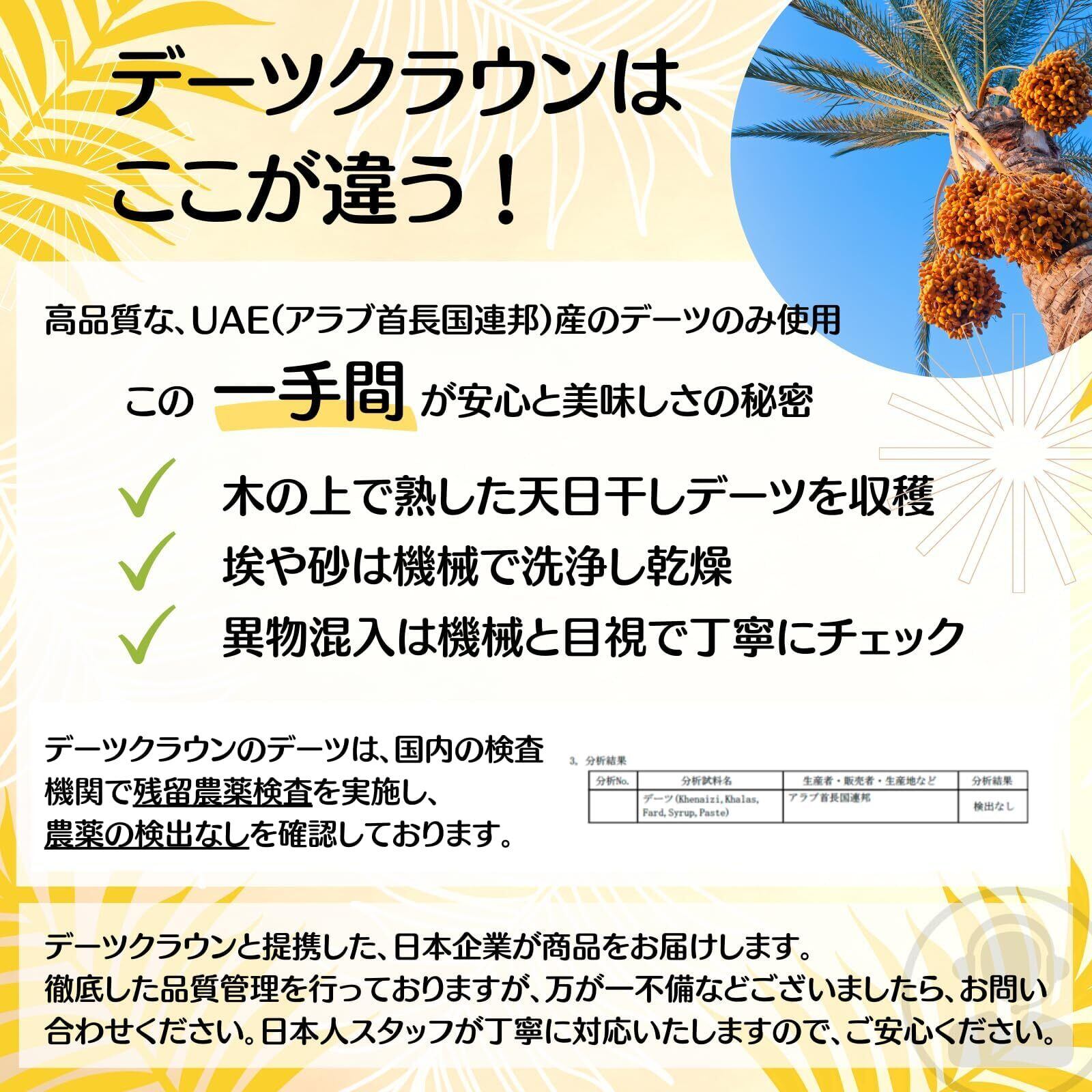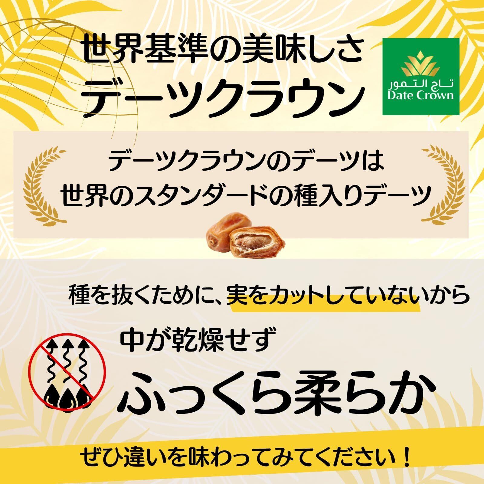 【本来のデーツの味を楽しむ】デーツクラウンのデーツは、種入りです。種抜きは実をカットするため少し硬い食感ですが、デーツクラウンは種入りのためデーツ本来の柔らかさを味わうことができます。本場のデーツを本場の食べ方で、それがデーツクラウンのこだわりです。無添加、砂糖不使用、オイル不使用、非遺伝子組換え、残留農薬検査済(日本)のデーツです。