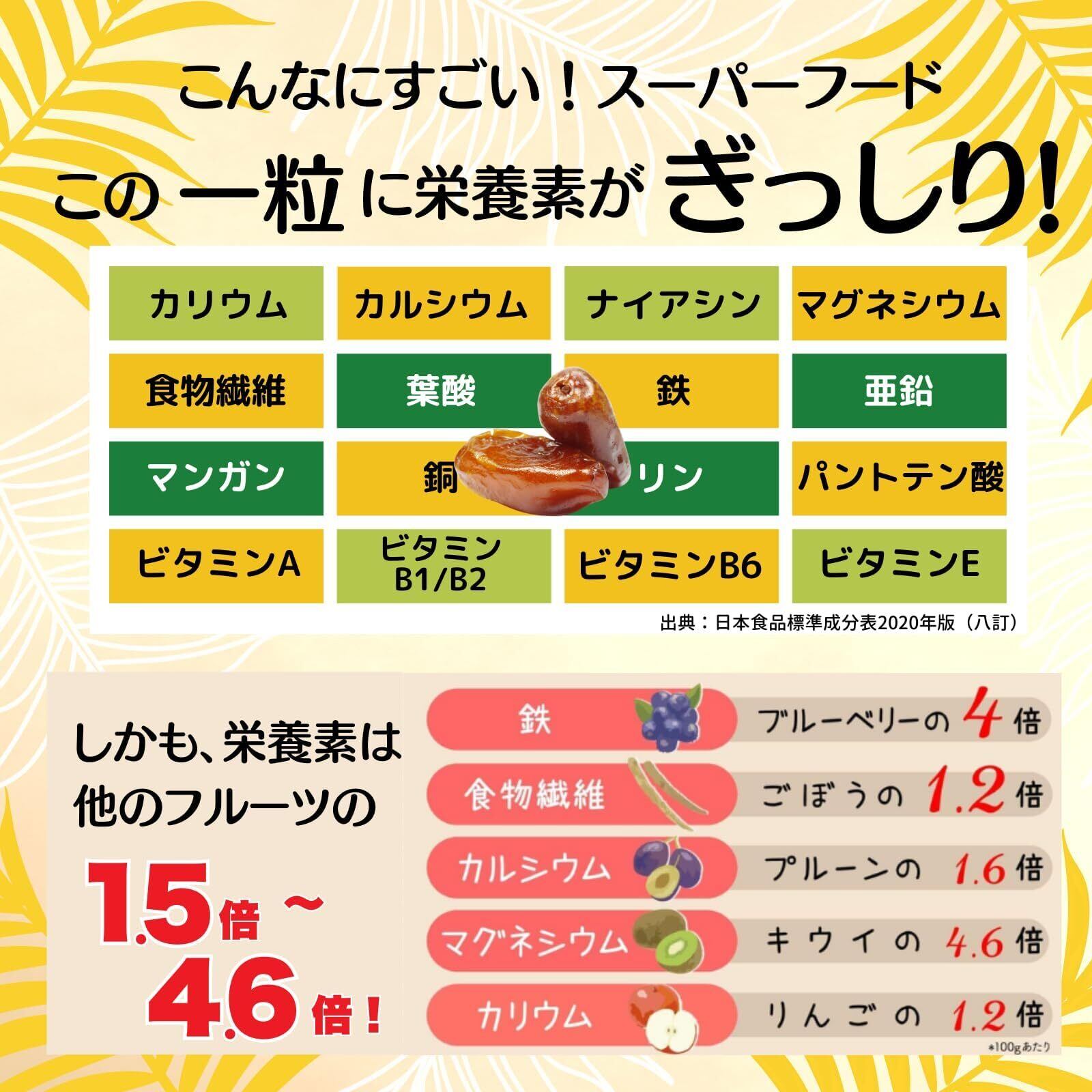 【スーパーフードのデーツ】スーパーフードのデーツは、一粒に栄養素がぎっしり。食物繊維・カリウム・マグネシウム・鉄・各種ビタミンなど栄養素がたっぷり含まれており、その栄養素の高さから、中東ではラマダンの断食後にデーツが重要な栄養補給源として食べられています。