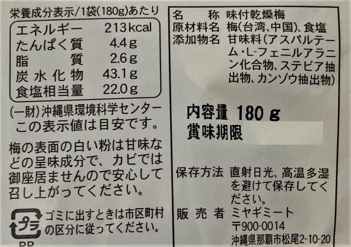 【原材料名】梅(台湾、中国)、食塩 【添加物名】甘味料(アスパルテーム・L-フェニルアラニン化合物、ステビア抽出物、カンゾウ抽出物)