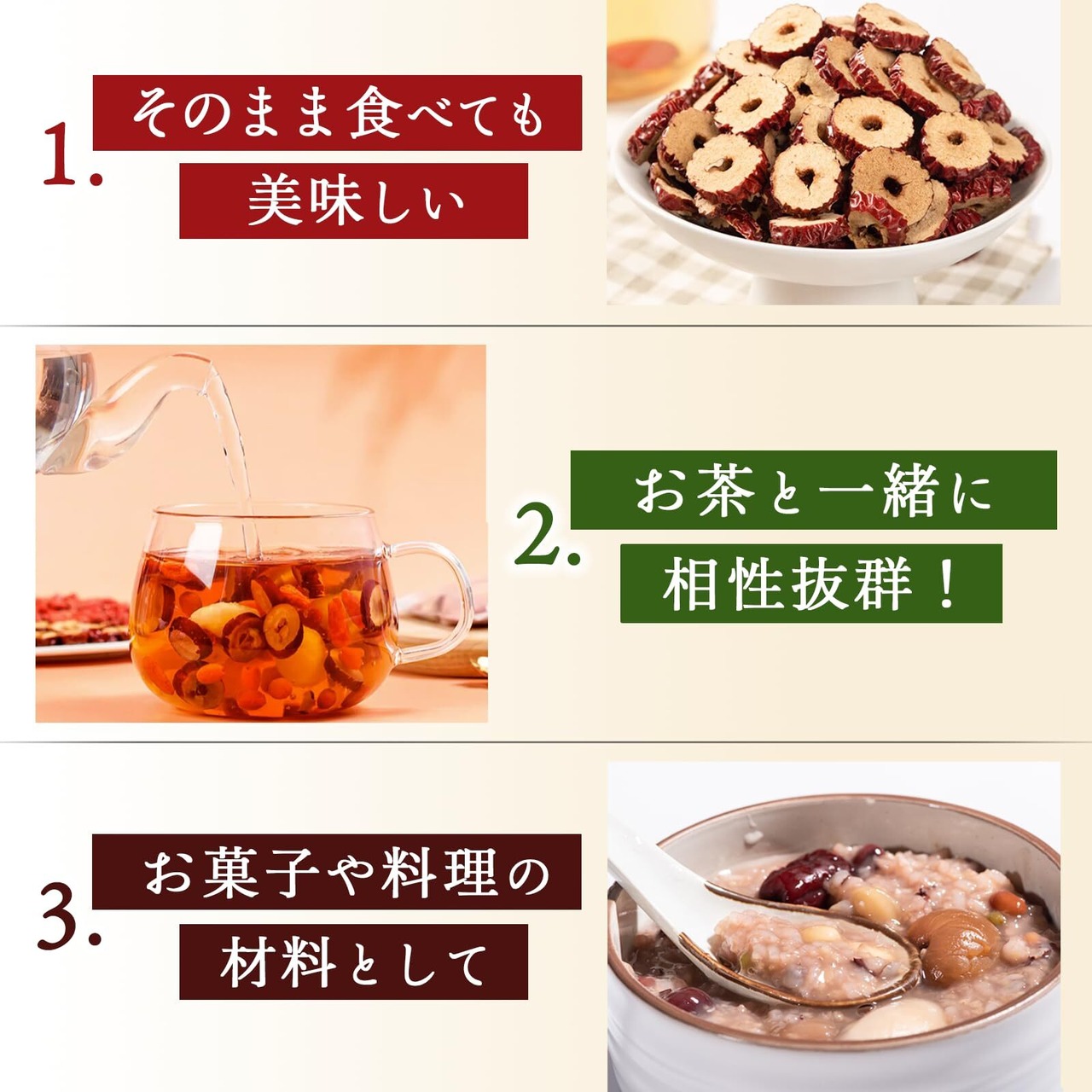 4【多彩な使い方】なつめチップスは、そのままお召し上がりいただくだけでなく、様々な使い方があります。お湯に入れてお茶にしたり、ヨーグルトやシリアルのトッピングとして利用したり、サラダやデザートにアクセントとして添えたりすることもできます。
