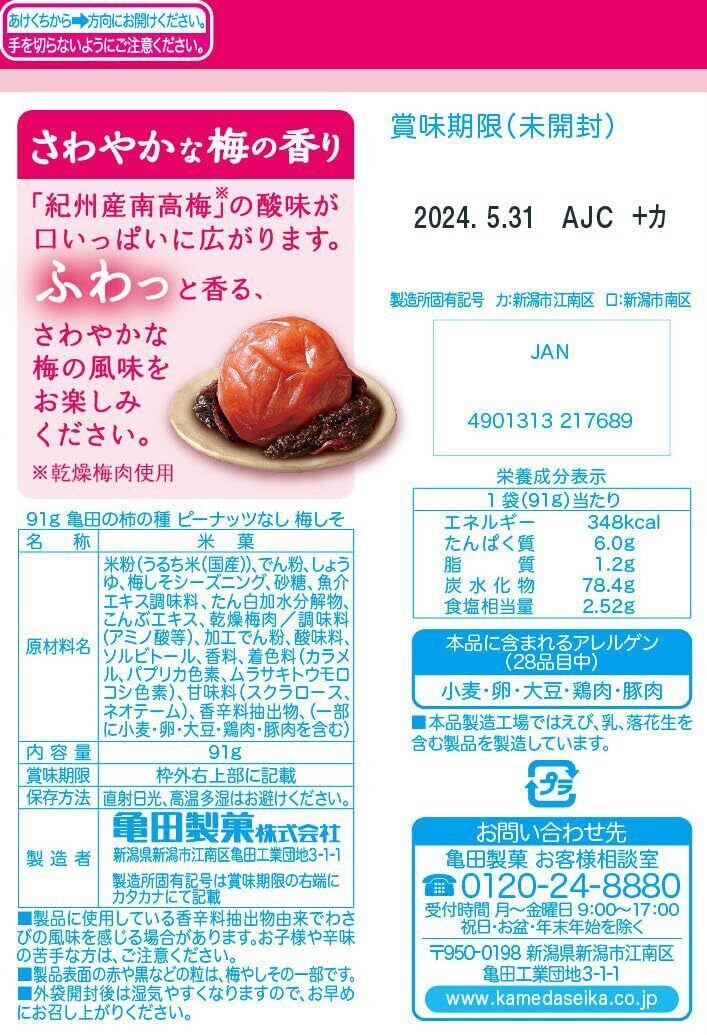 亀田製菓 亀田の柿の種ピーナッツなし 梅しそ 91g×12袋