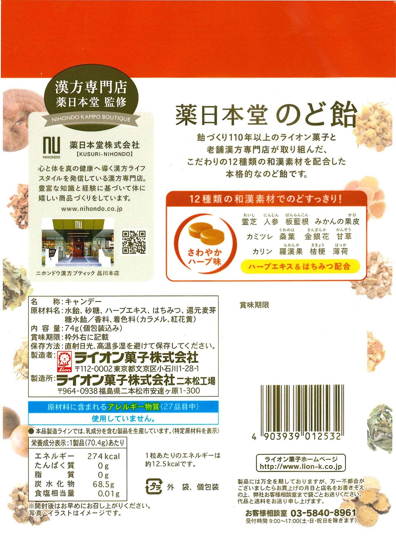 ライオン菓子 薬日本堂のど飴 74g×6袋