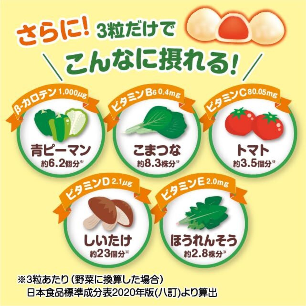 野菜だけでなく、β-カロテン、ビタミンB6、ビタミンC、ビタミンD、ビタミンEがたっぷり入っています。