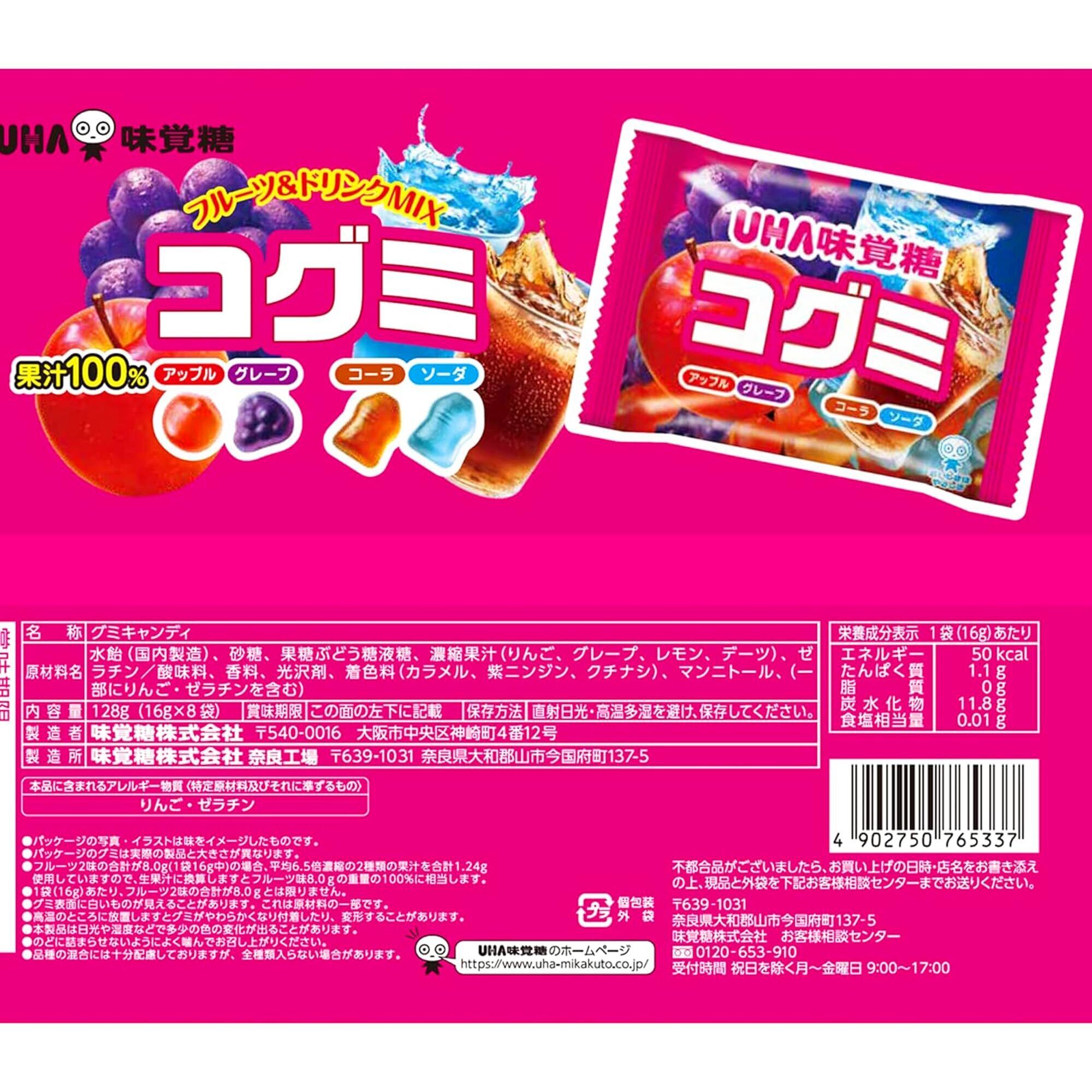 ぷにぷに食感の小粒グミの4種アソート。ミニパックが8袋入ったファミリーパックです。グレープ・アップル・コーラ・ソーダをアソートにしました。