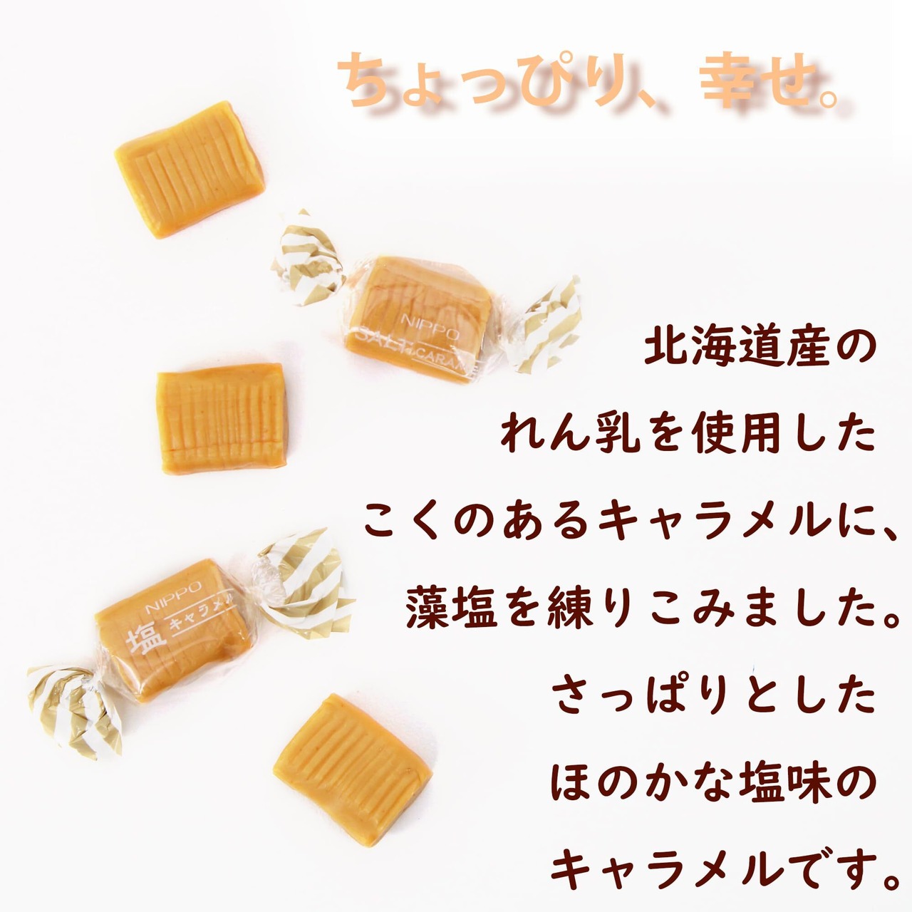 北海道産のれん乳を100%使用した、濃厚なミルク味のキャラメルに藻塩を練り込みました。さっぱりとしたほのかな塩味のキャラメルです。