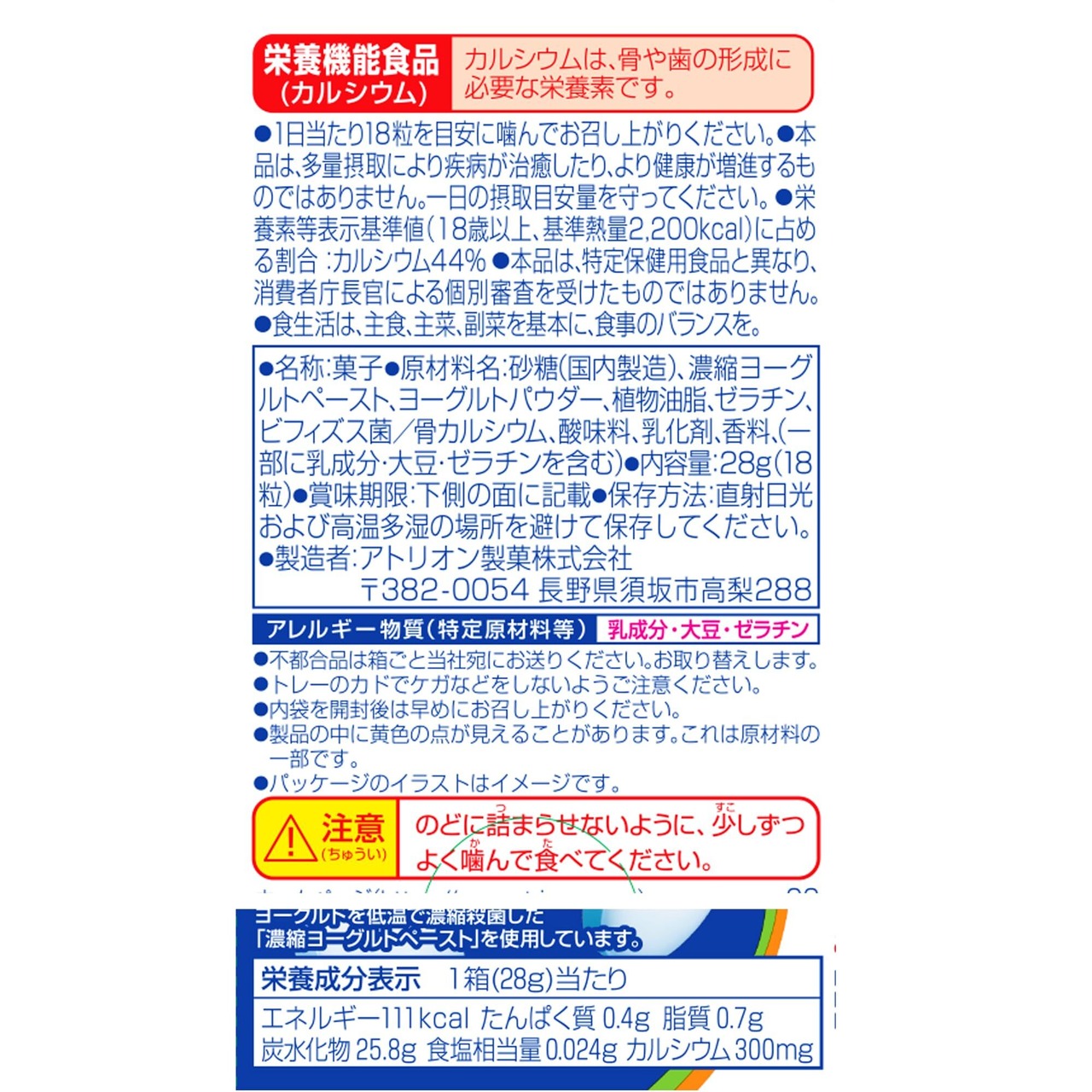 砂糖(国内製造)、濃縮ヨーグルトペースト、ヨーグルトパウダー、植物油脂、ゼラチン、ビフィズス菌/骨カルシウム、酸味料、乳化剤、香料、(一部に乳成分・大豆・ゼラチンを含む)