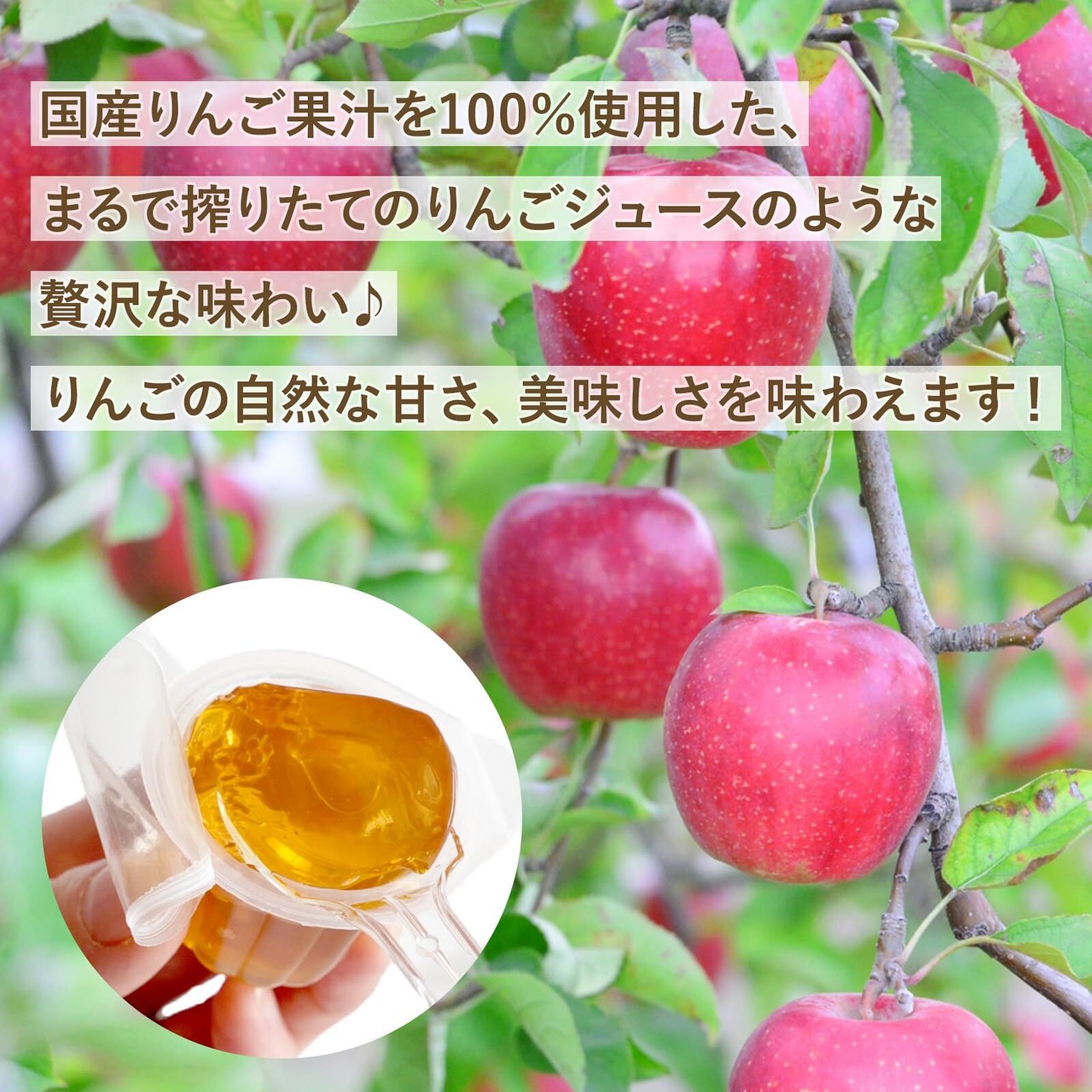 お子さまも安心して美味しく食べれるこだわりのゼリー。 国産りんご果汁を100%使用した、まるで絞りたてのりんごジュースのような贅沢な味わいです。