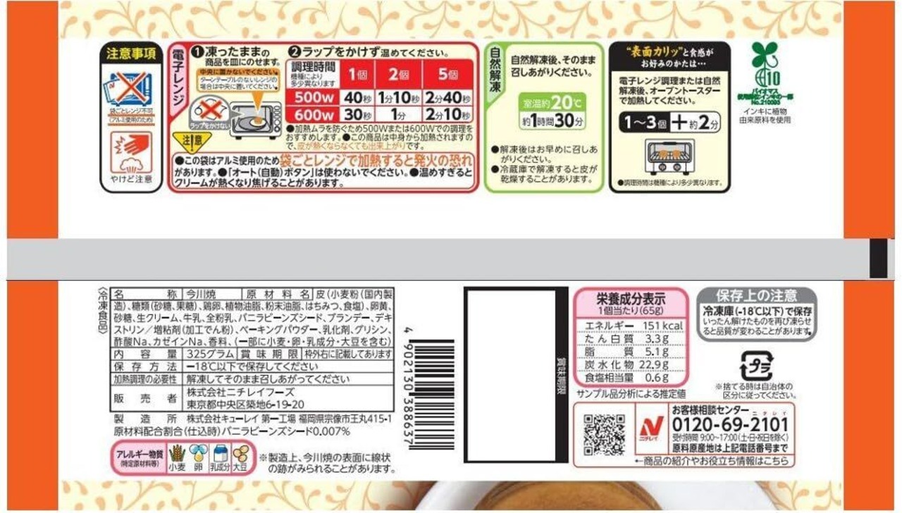 皮(小麦粉(国内製造)、鶏卵、糖類(砂糖、果糖)、植物油脂、粉末油脂、はちみつ、食塩)、卵黄、砂糖、生クリーム、牛乳、全粉乳、バニラビーンズシード、ブランデー、デキストリン/増粘剤(加工でん粉)、ベーキングパウダー、乳化剤、グリシン、酢酸Na、カゼインナトリウム、香料、(一部に小麦・卵・乳成分・大豆を含む)