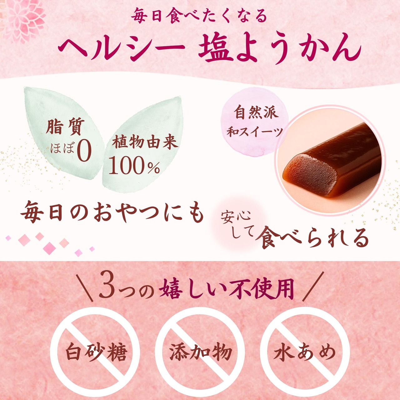 【てんさい糖で“まろやかキレ味”】白砂糖ではなく北海道産てんさい糖を採用。まろやかな甘みとコクが赤穂の塩と重なり、後味は驚くほどキレ良く、羊羹の甘さの余韻だけを残します。甘党でなくてもクセになる上品さです。