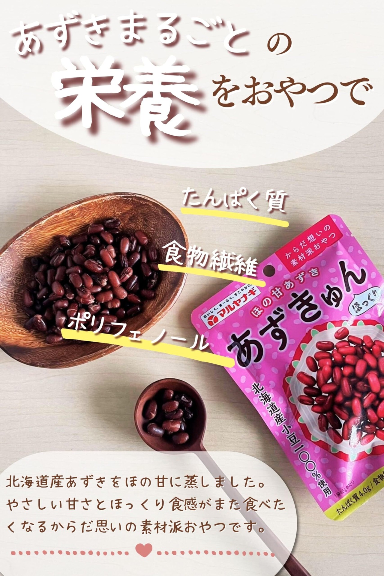 健康や美容に気を使う方に最適な「あずきゅん」は、たんぱく質や食物繊維がとれるお菓子です。北海道産小豆を使用しており、手軽に日々の食事に取り入れることができます。毎日の食事やおやつに良質な素材を加えたい方におすすめ。あずきゅんは開けてそのまま食べられ、大豆よりも甘みが深く、あずきの旨味を味わえます。じっくり蒸したことによりホクホクとした食感が生まれ、噛みごたえがあります。噛むたびに広がるあずきの芳醇な風味が料理を引き立てます。一般的な大豆よりも甘みがあるのでおやつやヨーグルトのトッピングにぴったり!