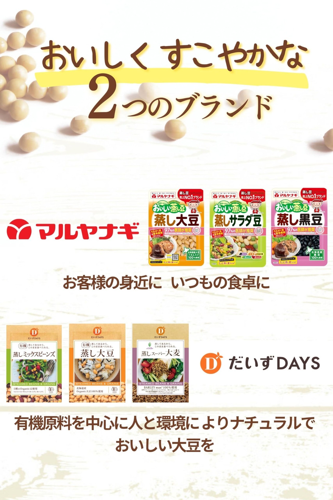 【しっかりとした食感】蒸したことによりまめにホクホクとした食感が生まれ、噛みごたえがプラスされました。お弁当に加えても崩れにくく、噛むたびに広がる小豆の芳醇な風味が料理を引き立てます。一般的なまめ製品よりも甘みがあるので煮物やサラダにもぴったり!料理の楽しみが増える一品です。