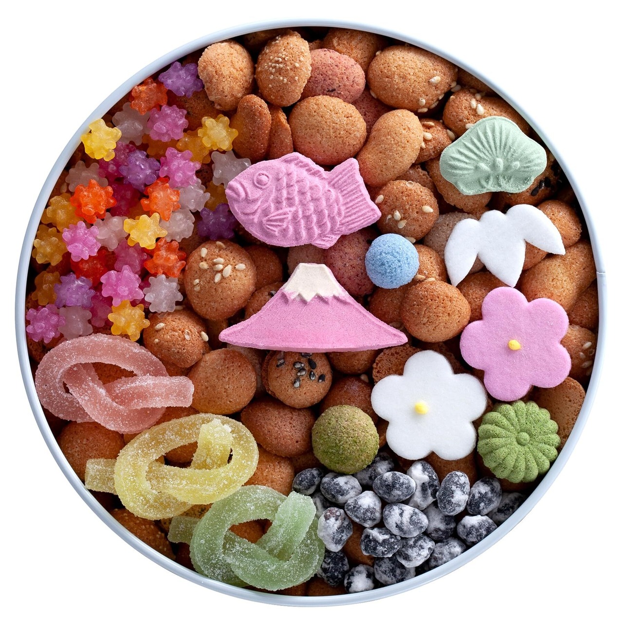 小麦粉、砂糖、鶏卵、和三盆糖、大豆、ごま、黒糖、抹茶、しそ粉(赤しそ、食塩、梅酢)、生姜粉末、ココナッツ、けしの実、ココア、青海苔、豌豆粉、餅米粉、澱粉、水飴、寒天、食用精製加工油脂、食用植物油脂