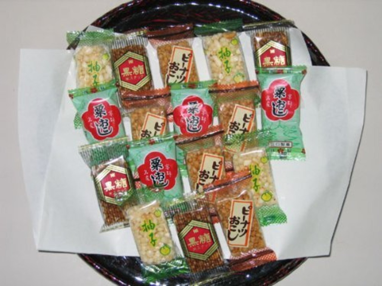 原材料:糖類(砂糖、水飴、黒糖、加工黒糖)、米(国産)、小麦粉、澱粉、ピーナツバター、生姜、柚子ペースト、ごま、落花生、植物油脂、カラメル色素、食塩、膨脹剤