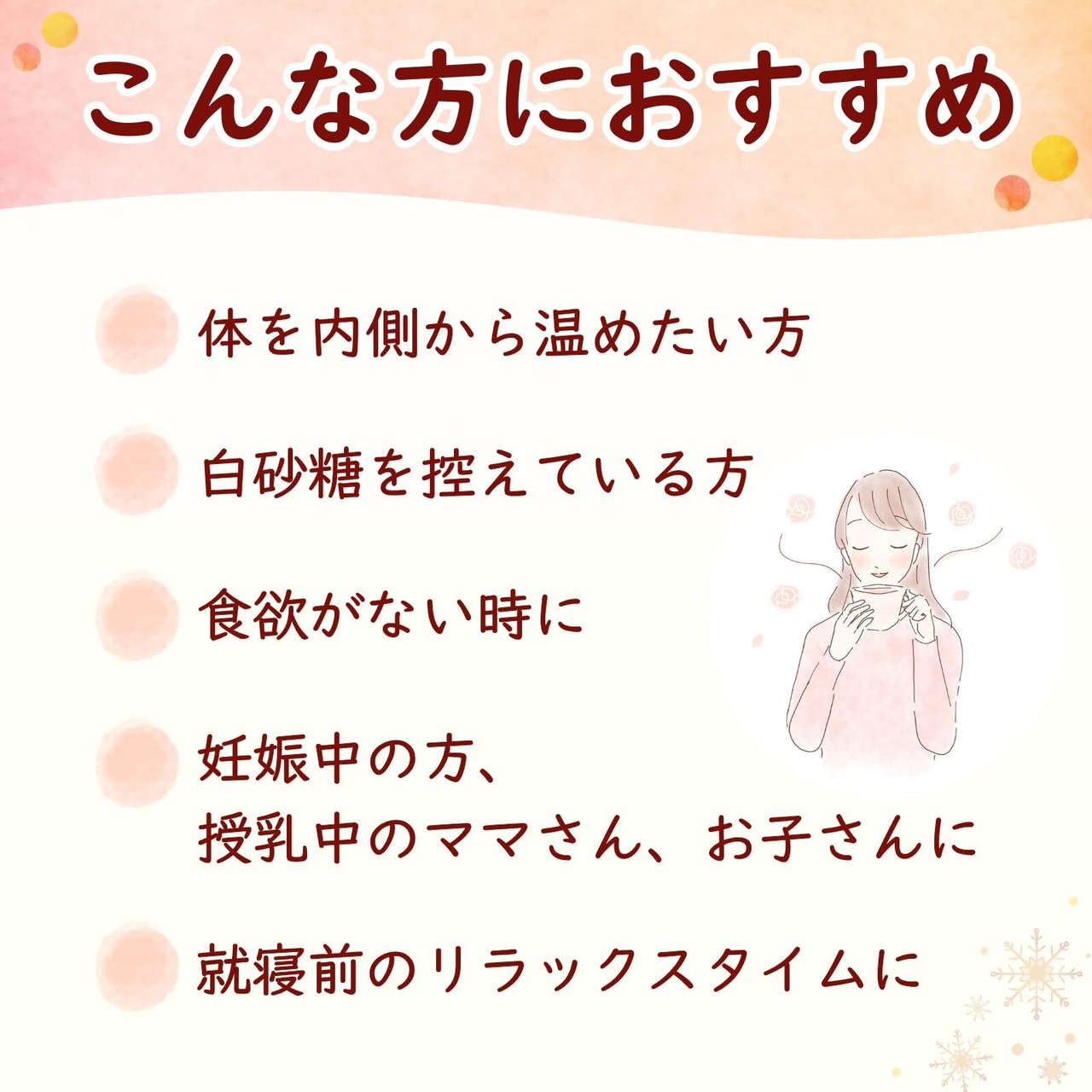 【白砂糖不使用】北海道産てんさい糖を使用し、やさしい甘さに仕上げました。従来のくず湯と比べて甘さ控えめなので、白砂糖特有の甘さが苦手な方にぴったりです。