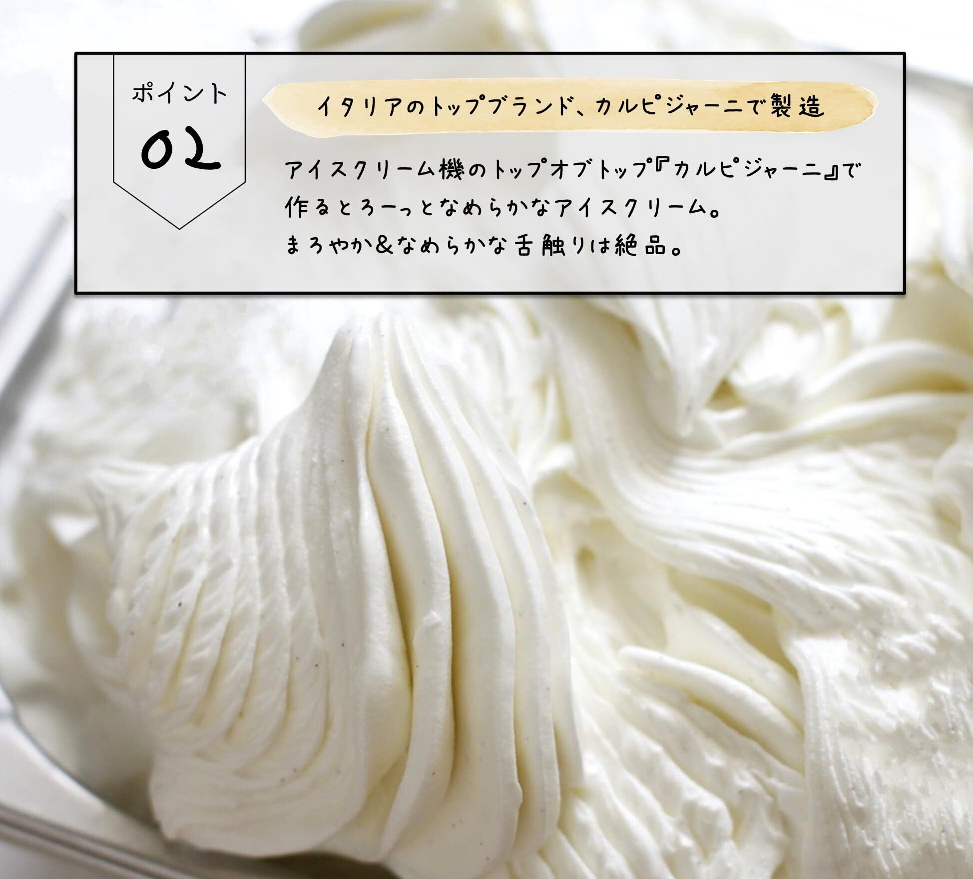 アイスクリームの製造機は70年の歴史を誇るイタリアのトップブランド、カルピジャーニ製を使用。これが驚きのとろーっとしたなめらかなアイスクリームを作る最高級の製造機なんです。ぜひ、アイスクリーム界のトップ・オブ・ザ・トップを誇る製造機の味をお試しください。