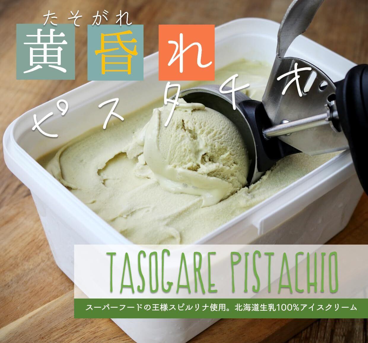 黄昏れピスタチオ:一番人気のピスタチオアイス。藍藻類の一種のスーパーフードの王様スピルリナ使用。ピスタチオ特有の香ばしさとミルクの相性抜群。
