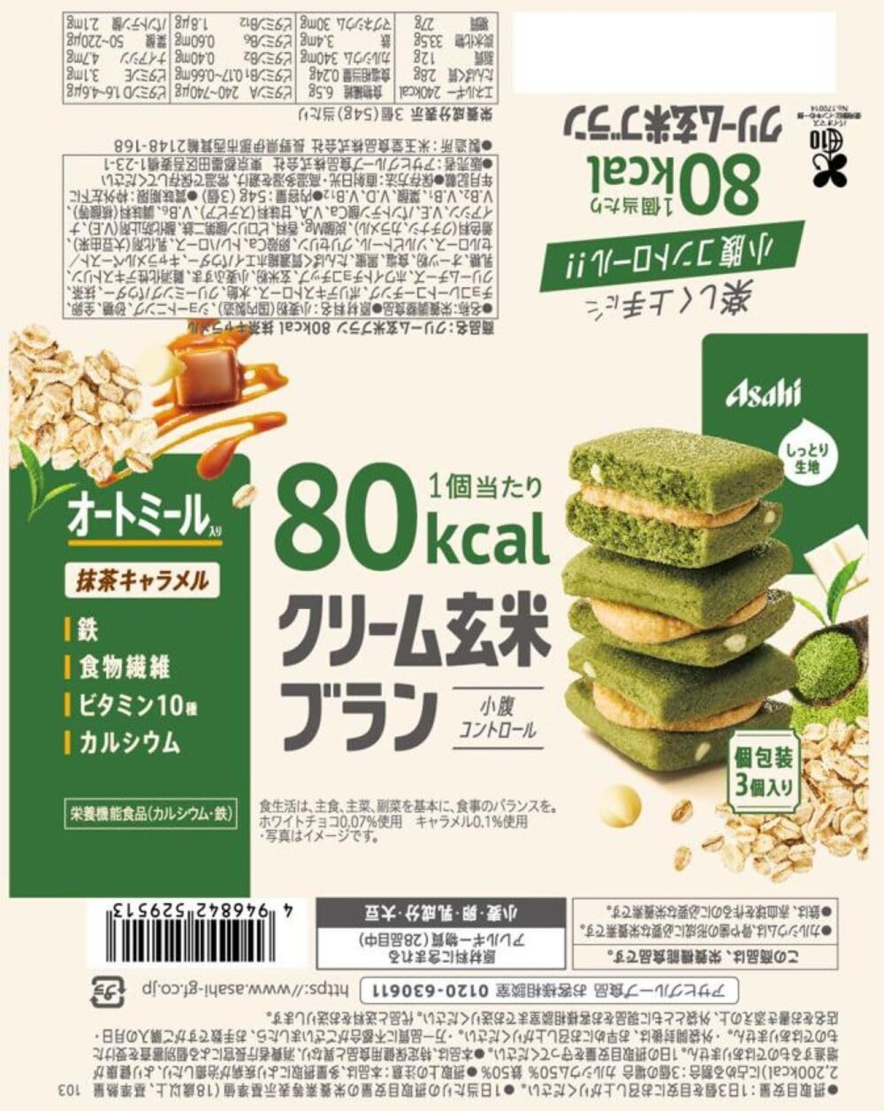 「小麦ブラン」と「玄米」を、おいしく食べやすくした1個当たり80kcalのクリームサンドタイプの栄養調整食品です。小腹が空いたときにぴったりです。ヘルシー素材:オートミール配合。食べこぼれしにくい「しっとり生地」タイプ。本格的な抹茶と濃厚なキャラメルのほろ苦い甘さが楽しめる味。1個包装タイプ (1製品3個入り)。ビタミン10種、食物繊維、カルシウム、鉄を配合。栄養機能食品(カルシウム・鉄)。1個当たりのカロリー"80kcal"とヘルシー素材として配合した"オートミール"がわかりやすいシンプルですっきりとしたデザイン。