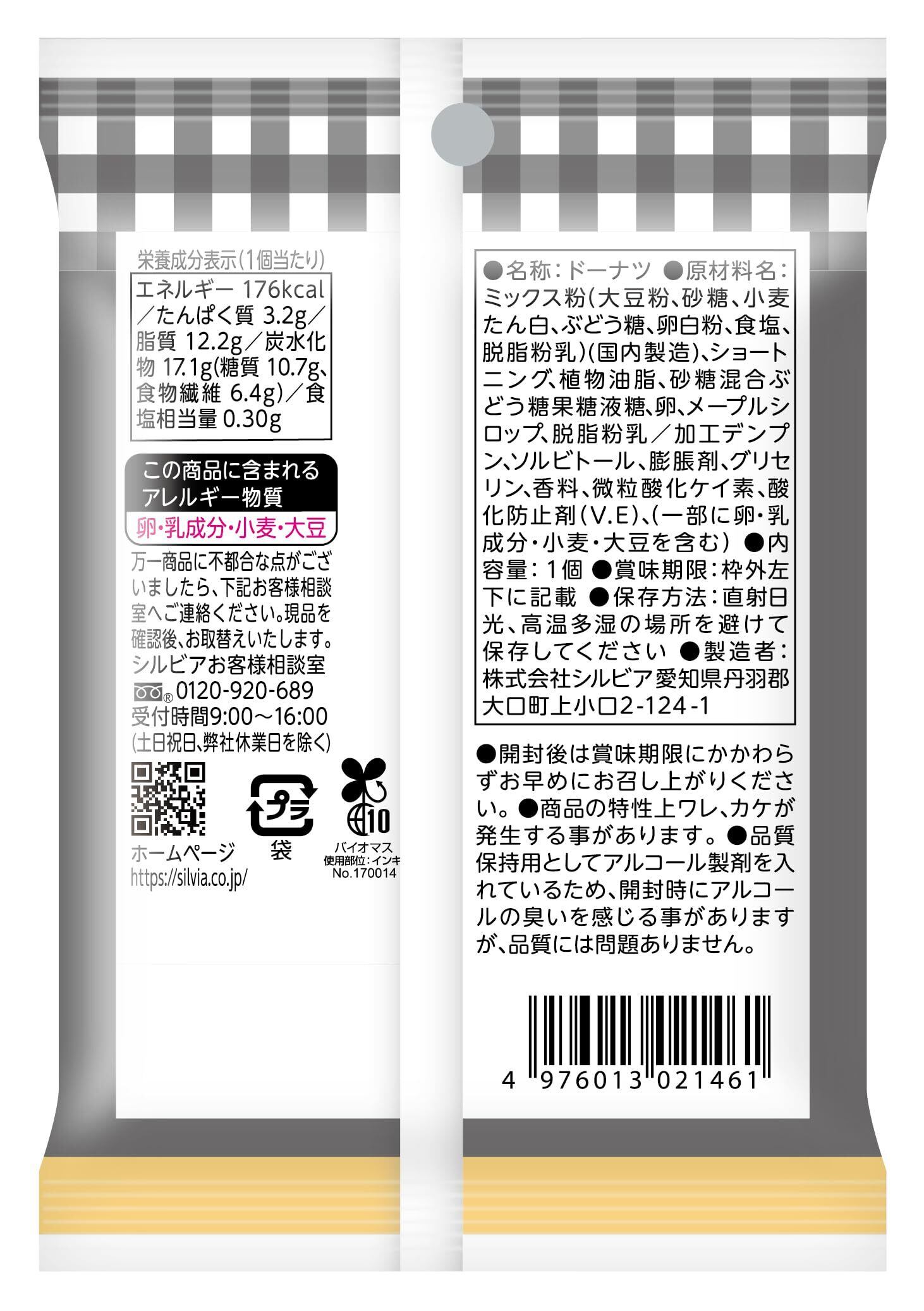 ミックス粉(大豆粉、砂糖、小麦たん白、ぶどう糖、卵白粉、食塩、脱脂粉乳)(国内製造)、ショートニング、植物油脂、砂糖混合ぶどう糖果糖液糖、卵、メープルシロップ、脱脂粉乳/加工デンプン、ソルビトール、膨脹剤、グリセリン、香料、微粒酸化ケイ素、酸化防止剤(V.E)、(一部に卵・乳成分・小麦・大豆を含む)
