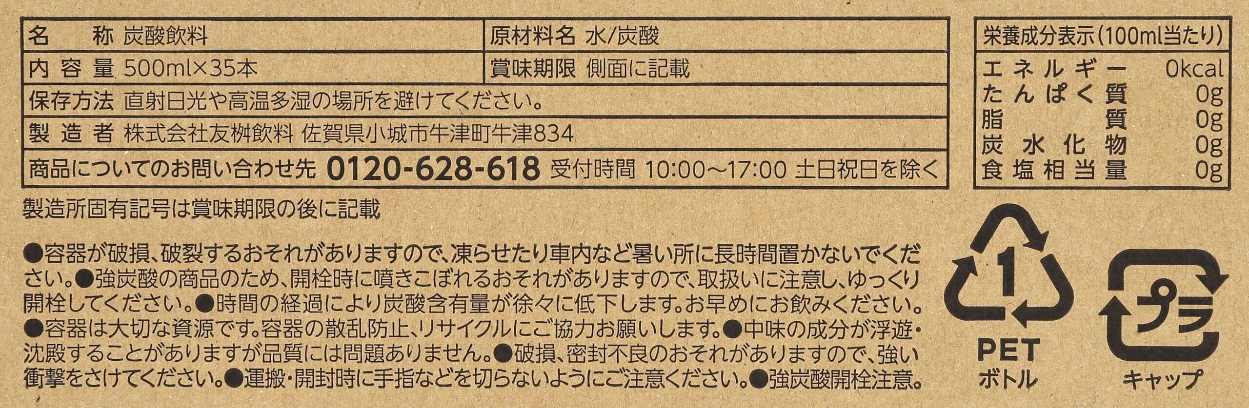 原材料:水/炭酸 栄養成分(100ml当たり):エネルギー0kcal、たんぱく質0g、脂質0g、炭水化物0g、食塩相当量0g