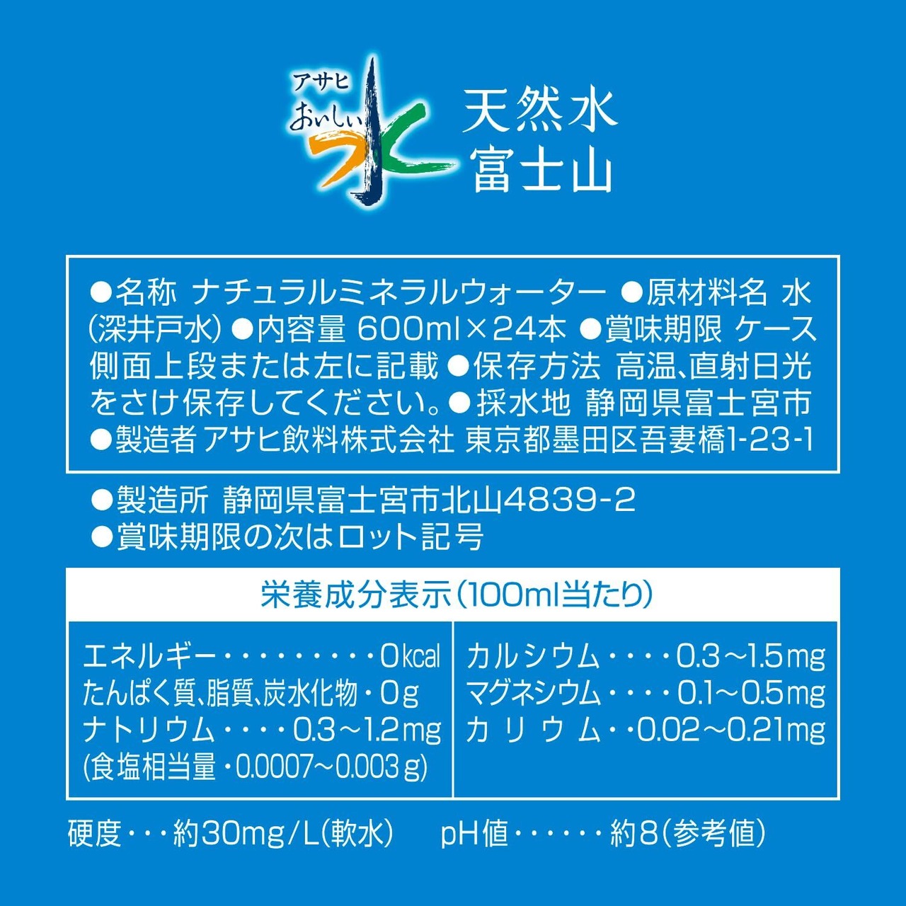 栄養成分表示(100mL当たり)エネルギー0kcal,たんぱく質、脂質、炭水化物0g,ナトリウム0.3~1.2mg,(食塩相当量0.0007~0.003g),カルシウム0.3~1.5mg,マグネシウム0.1~0.5mg,カリウム0.02~0.21mg