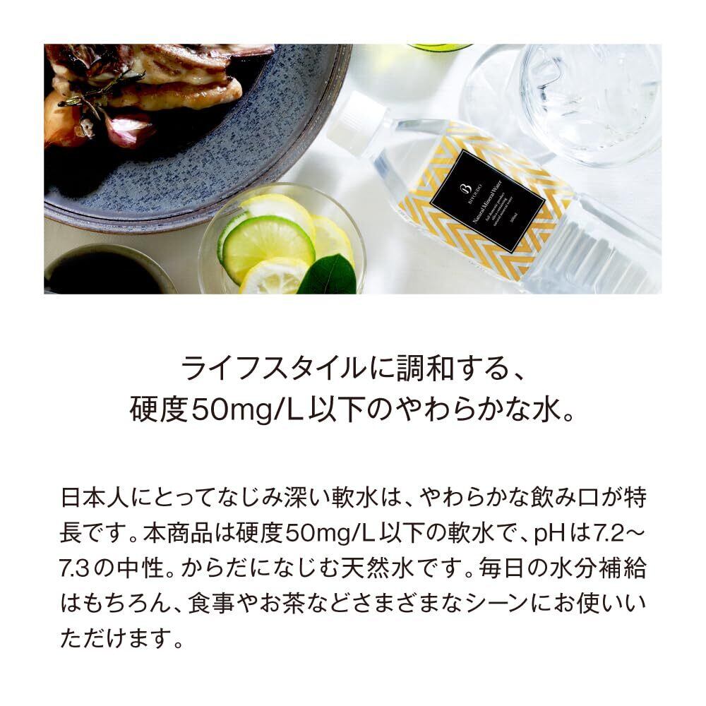 【ライフスタイルに調和する、硬度50mg/L以下のやわらかな水。】 日本人にとってなじみ深い軟水は、やわらかな飲み口が特長です。本商品は硬度50mg/L 以下の軟水で、pHは7.2~7.3 の中性。からだになじむ天然水です。毎日の水分補給はもちろん、食事やお茶などさまざまなシーンにお使いいただけます。