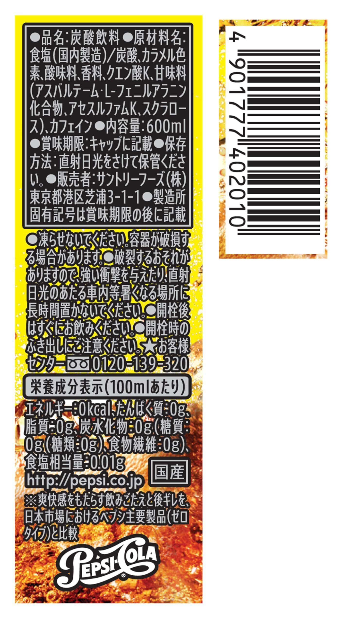 原材料:食塩(国内製造)/炭酸、カラメル色素、酸味料、香料、クエン酸K、甘味料(アスパルテーム・L-フェニルアラニン化合物、アセスルファムK、スクラロース)、カフェイン