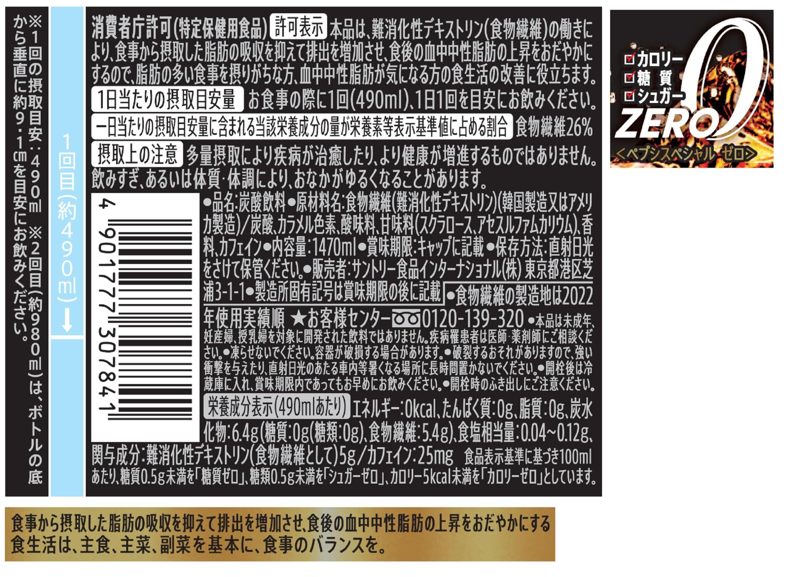 原材料:食物繊維(難消化性デキストリン)(アメリカ製造又は韓国製造)/炭酸、カラメル色素、酸味料、甘味料(スクラロース、アセスルファムカリウム)、香料、カフェイン