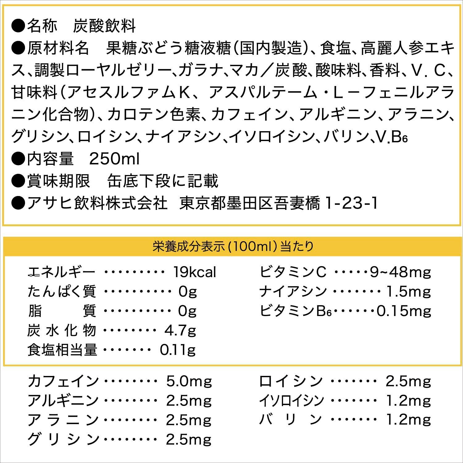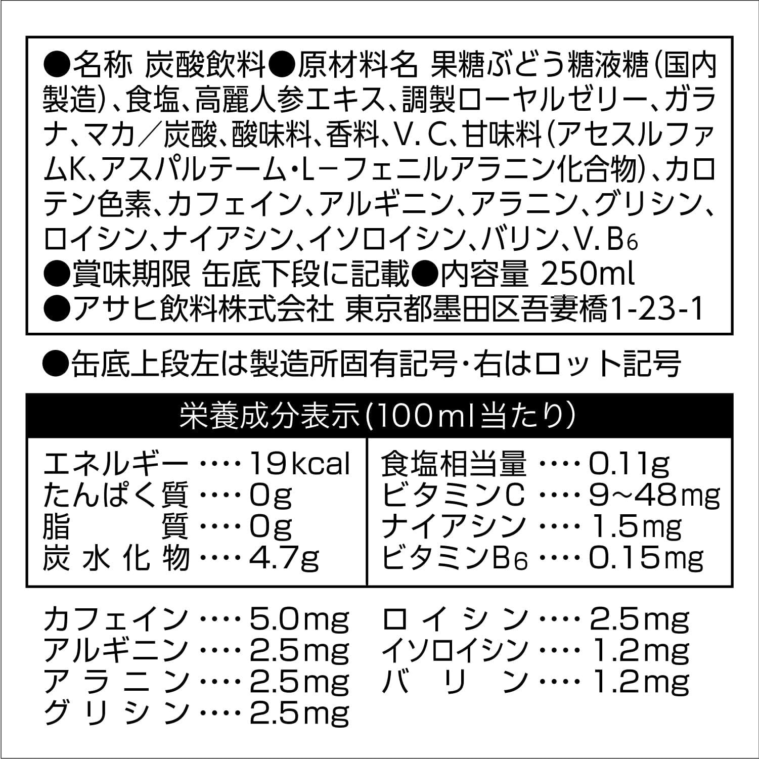 果糖ぶどう糖液糖(国内製造)、高麗人参エキス、調製ローヤルゼリー、ガラナ、マカ/炭酸、酸味料、香料、V.C、甘味料(アセスルファムK、スクラロース)、カロテン色素、カフェイン、アルギニン、アラニン、グリシン、ロイシン、ナイアシン、イソロイシン、バリン、V.B6