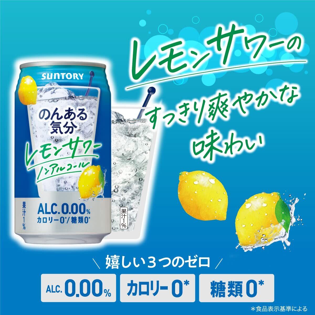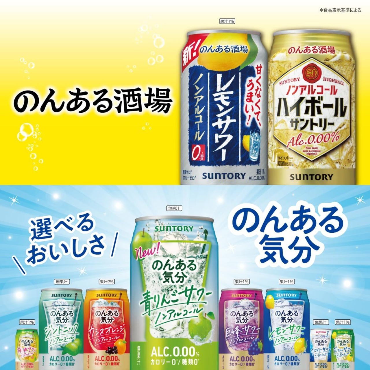 【のんある気分〈レモンサワーテイスト〉】サントリー「のんある気分 〈レモンサワーテイスト〉」は、地中海産レモン果汁を使用した、爽やかですっきりとした味わいのノンアルコールチューハイテイスト飲料です。 サントリー独自の「リアルテイスト製法」により、ノンアルコールでありながら“レモンサワー"のような、お酒らしい余韻のある味わいをお楽しみいただけます。