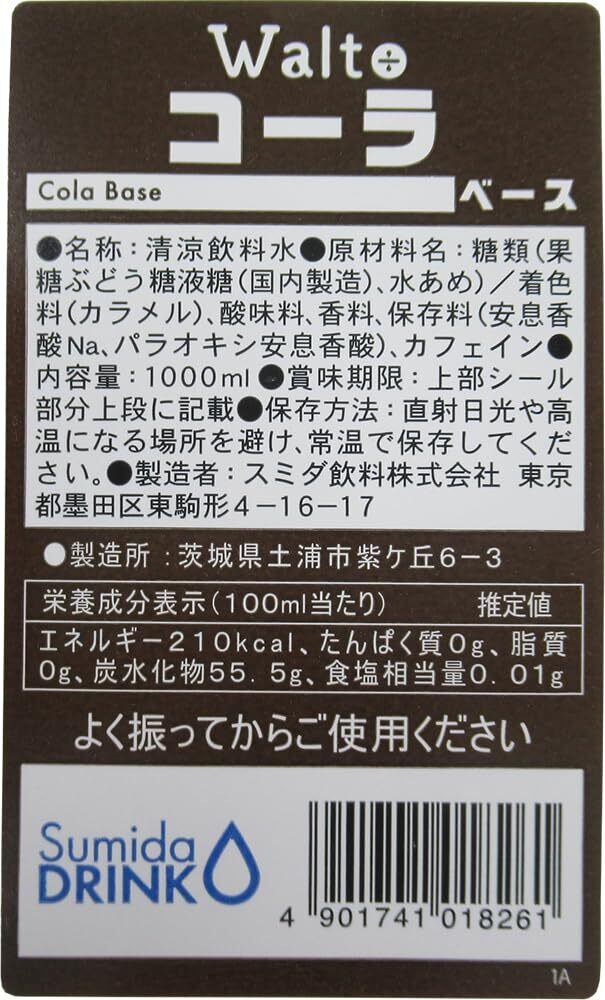 原材料(原産国):糖類(果糖ぶどう糖液糖(国内製造)、水あめ)/着色料(カラメル)、酸味料、香料、保存料(安息香酸Na、パラオキシ安息香酸)、カフェイン