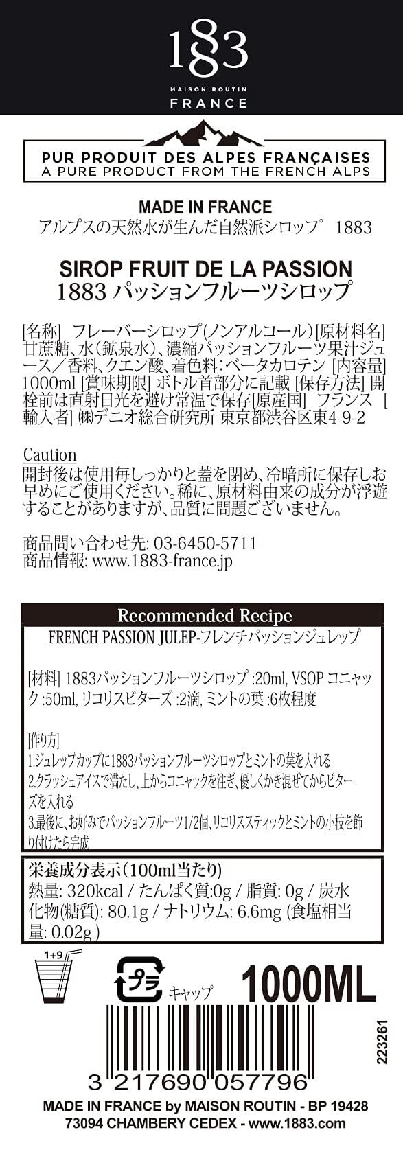 1883 Maison Routin (メゾン・ルータン) パッションフルーツ シロップ 1000ml 【割り材・調理】
